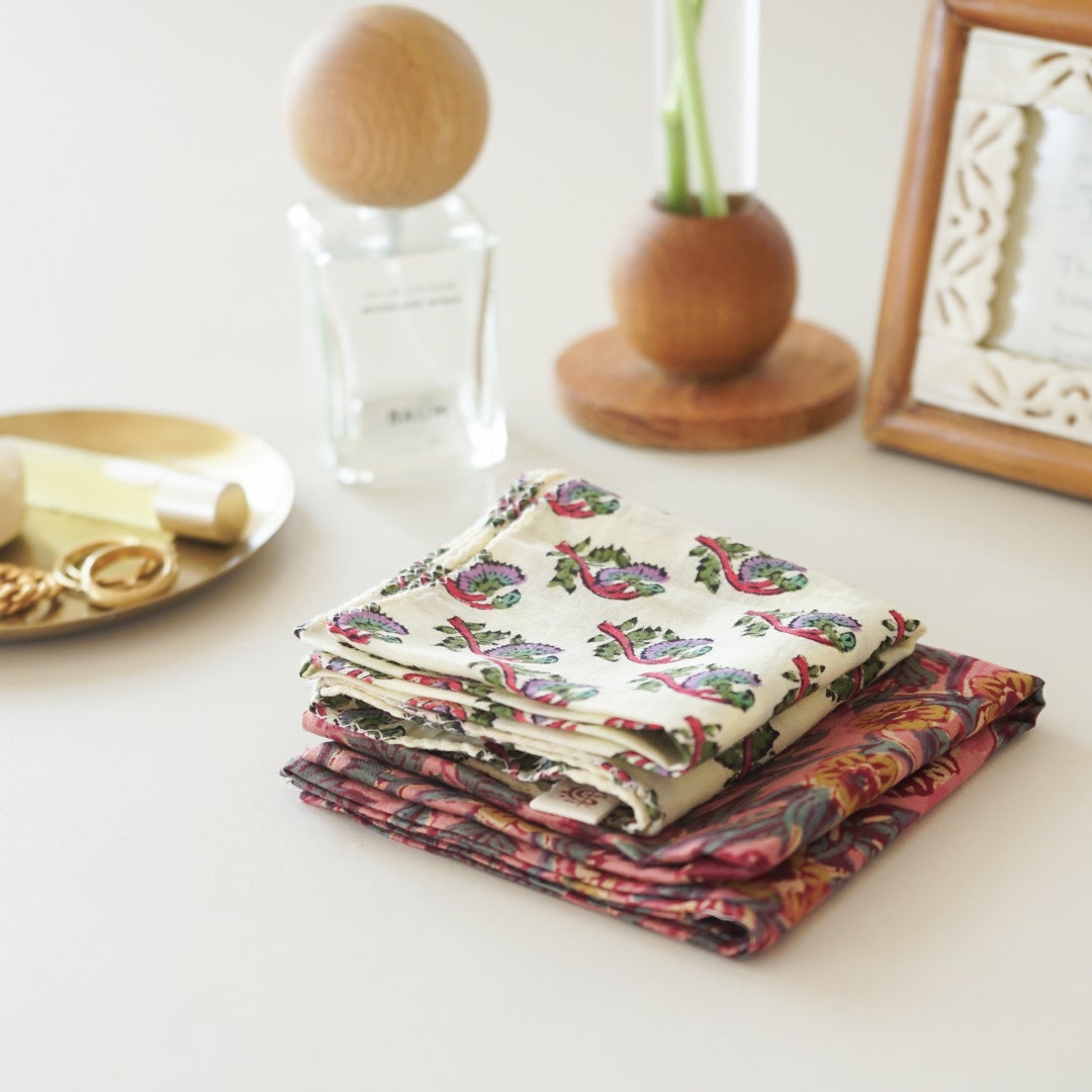 インドのハンドブロックプリントは、木のブロックスタンプを使用して布の柄を作り出す手法のこと。ブロックプリントの美しさを存分に味わうことができるファブリックアイテムが多数入荷します。