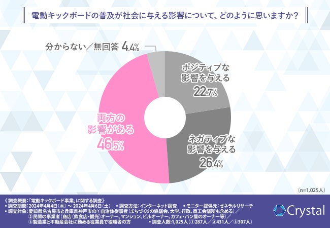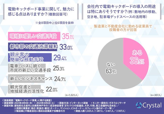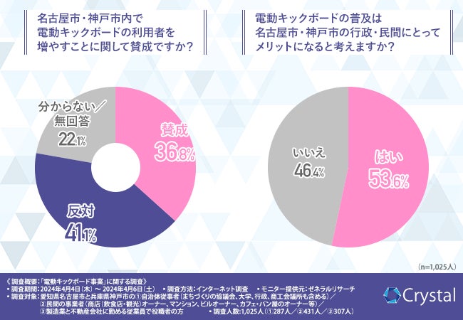 そこで今回、電動キックボードシェアリングサービス『Su__i(スーイ)』(https://su-i-ride.com/)を提供するCrystal株式会社は、愛知県名古屋市と兵庫県神戸市の①自治体従事者(まちづくりの協議会、大学、行政、商工会議所も含める)/②民間の事業者(商店<飲食店・観光>オーナー、マンション、ビルオーナー、カフェ・パン屋のオーナー等)/③製造業と不動産会社に勤める従業員で役職者の方を対象に、「電動キックボード事業」に関する調査を実施しました。