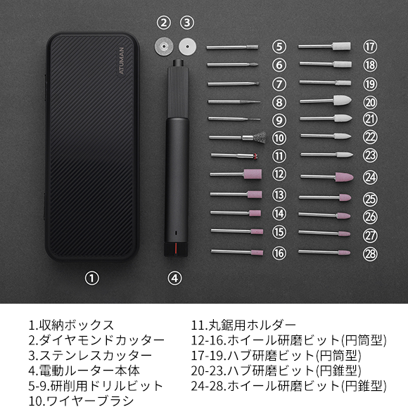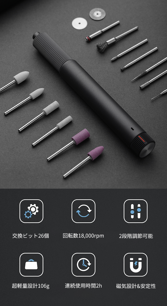 ② 26個の交換ビットを装備し、切断、研磨、穴あけ、彫刻などの機能を搭載。