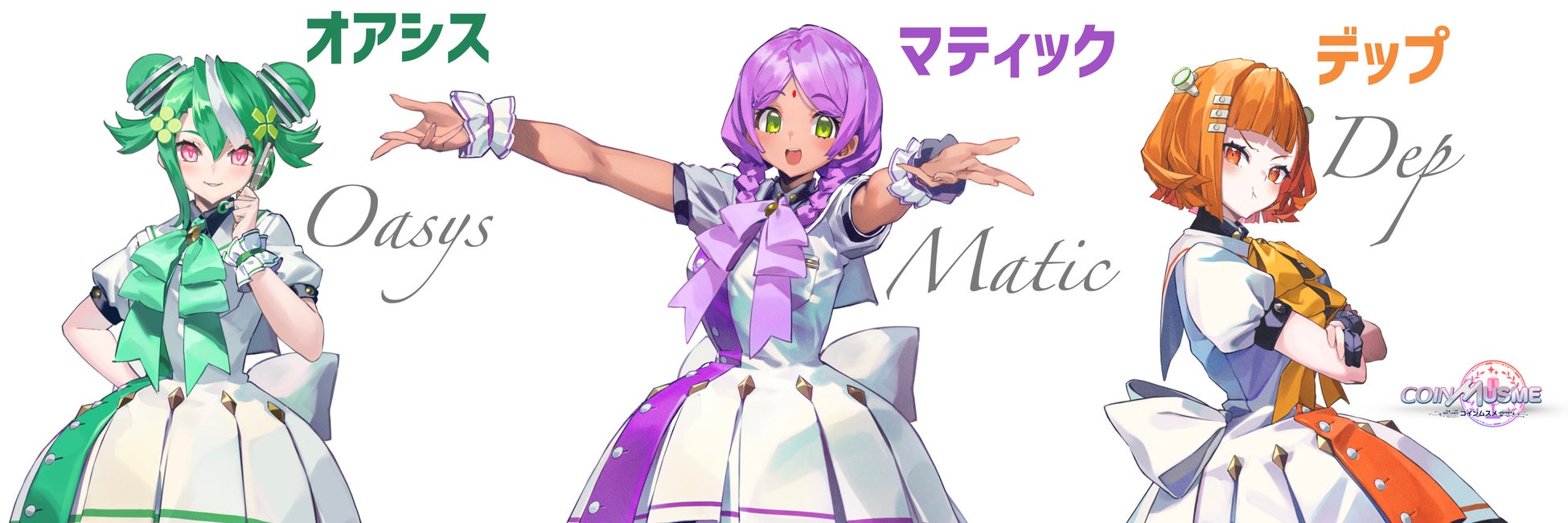 コインムスメはEureka Entertainment Ltd.が「新しい熱狂を生む、Play to Earnの世界的ロールモデルの創出」を掲げて開発する年内公開予定のブロックチェーンゲームで、仮想通貨をモチーフにしたアイドルキャラクターたちが登場します。