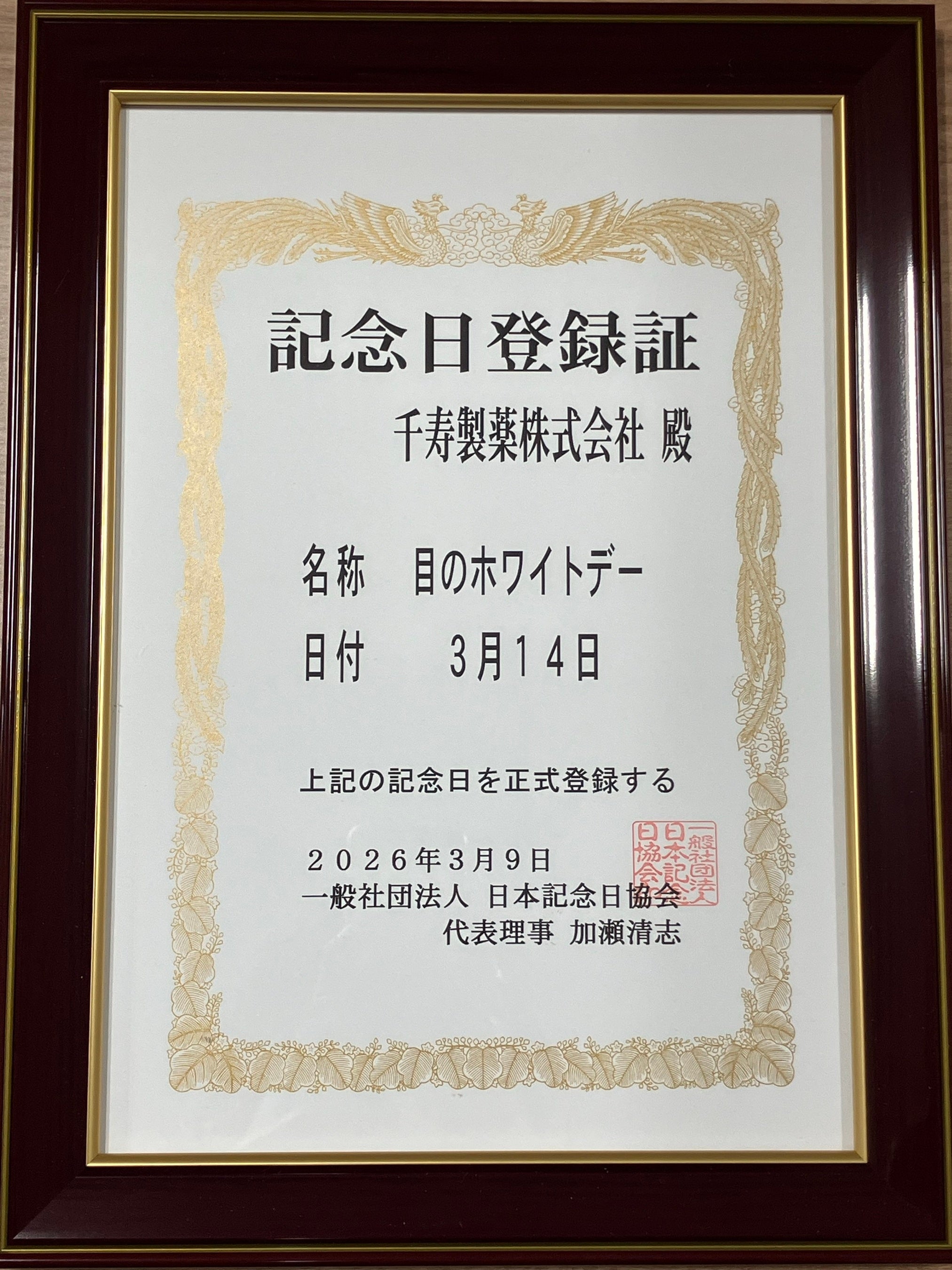 千寿製薬株式会社(本社:大阪府大阪市、代表取締役社長:吉田 周平、以下「千寿製薬」)は、この度、3月14日を「目のホワイトデー」として一般社団法人日本記念日協会(本部:長野県佐久市、代表理事:加瀬 清志、以下「日本記念日協会」)に記念日制定が認められ、記念日登録いたしました。