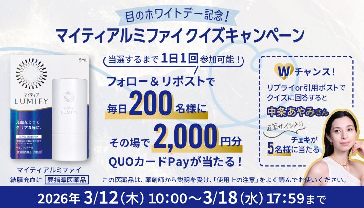 また3月14日は、日本で初めての充血除去成分(ブリモニジン酒石酸塩)を配合した、結膜充血に効能を持つ点眼液である「マイティアルミファイ」(OTC 医薬品:要指導医薬品)の発売日(2025年3月14日)でもあります。今回の制定を記念し、キャンペーンを実施いたします。