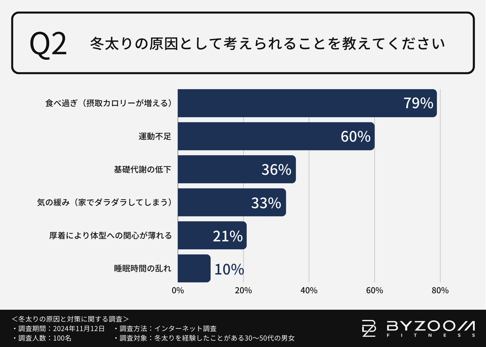 伺ってみたところ、「食べ過ぎ(摂取カロリーが増える)(79.0%)」「運動不足(60.0%)」という回答が上位に集まりました。