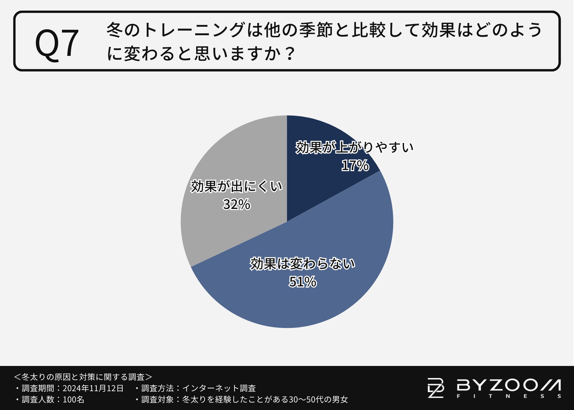 最後に、冬のトレーニングは他の季節と比較して効果はどのように変わると思うか伺ったところ、「効果は変わらない(51.0%)」「効果が出にくい(32.0%)」「効果が上がりやすい(17.0%)」という回答が集まりました。