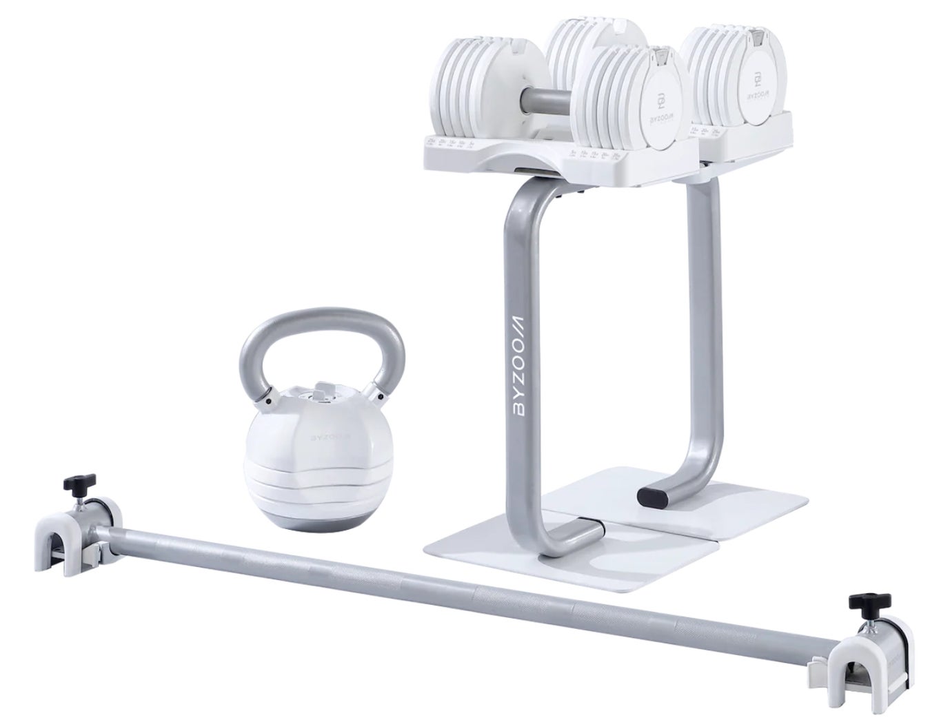 可変式ダンベル10kg×2個、可変式ケトルベル30LB、イージーバー、ダンベル専用スタンドがセットになったホームジムセットです。