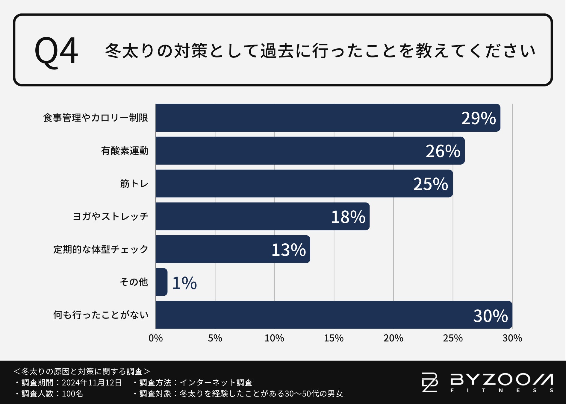 冬太りの対策として過去に行ったことについて伺ったところ、「何も行ったことがない(30.0%)」「食事管理やカロリー制限(29.0%)」「有酸素運動(26.0%)」という回答が集まりました。