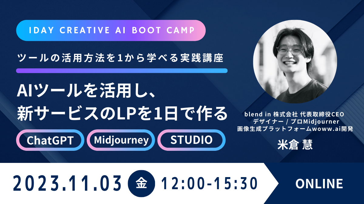 ■11月3日(金・祝)開催「AIツールを活用し、新サービスのLPを1日で作る|ChatGPT× Midjourney×STUDIO実践講座」