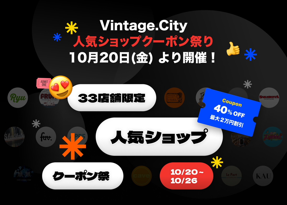 ヴィンテージ・ファッション・アプリ「Vintage.City(ヴィンテージ・シティ)」(会社:NAVER J.Hub Corporation(本社:東 京都品川区)、運営代行:株式会社MXN JAPAN(本社:東京都品川区))は、2023年10月20日(金)から 10月26日(木)まで、Vintage.Cityの33のショップでのお買物が最大20,000円割引になる40%OFFクーポンを配布 する「人気ショップクーポン祭り」(以下、本セール)を開催します。