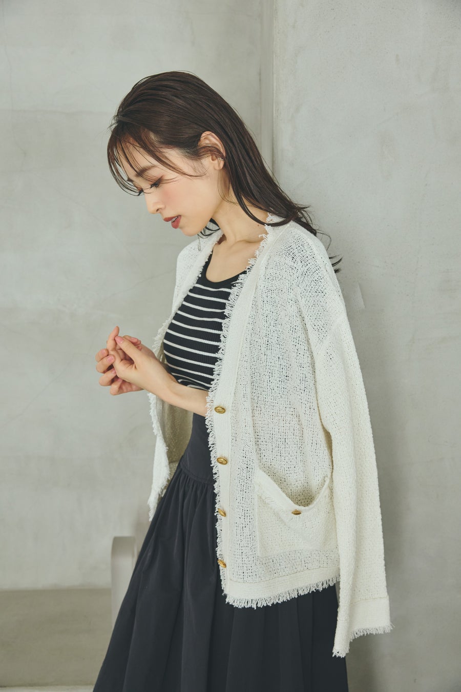 細ボーダー×タフタスカートのモノトーンコーデを軽やかに仕上げる、サマーツイード風のカーディガン。コットンを多く含んだ清涼感のある編み地に金ボタンをあしらってポイントに。肩にかけるだけで華やかな1着は冷房対策にも。