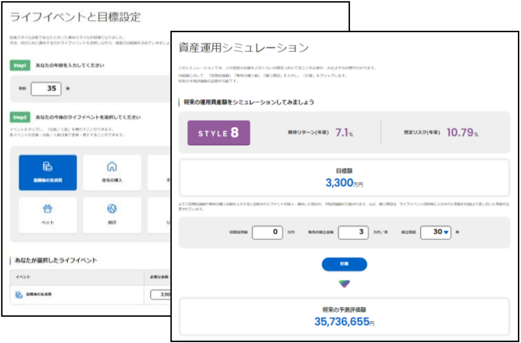…「ライフイベントと目標設定」から予定しているライフイベントを選択することで、将来必要な金額をお見積り!毎月の積立金額を入力すると将来の「資産運用シミュレーション」ができ、資産運用のゴールを明確にしてから投資をスタートできます。