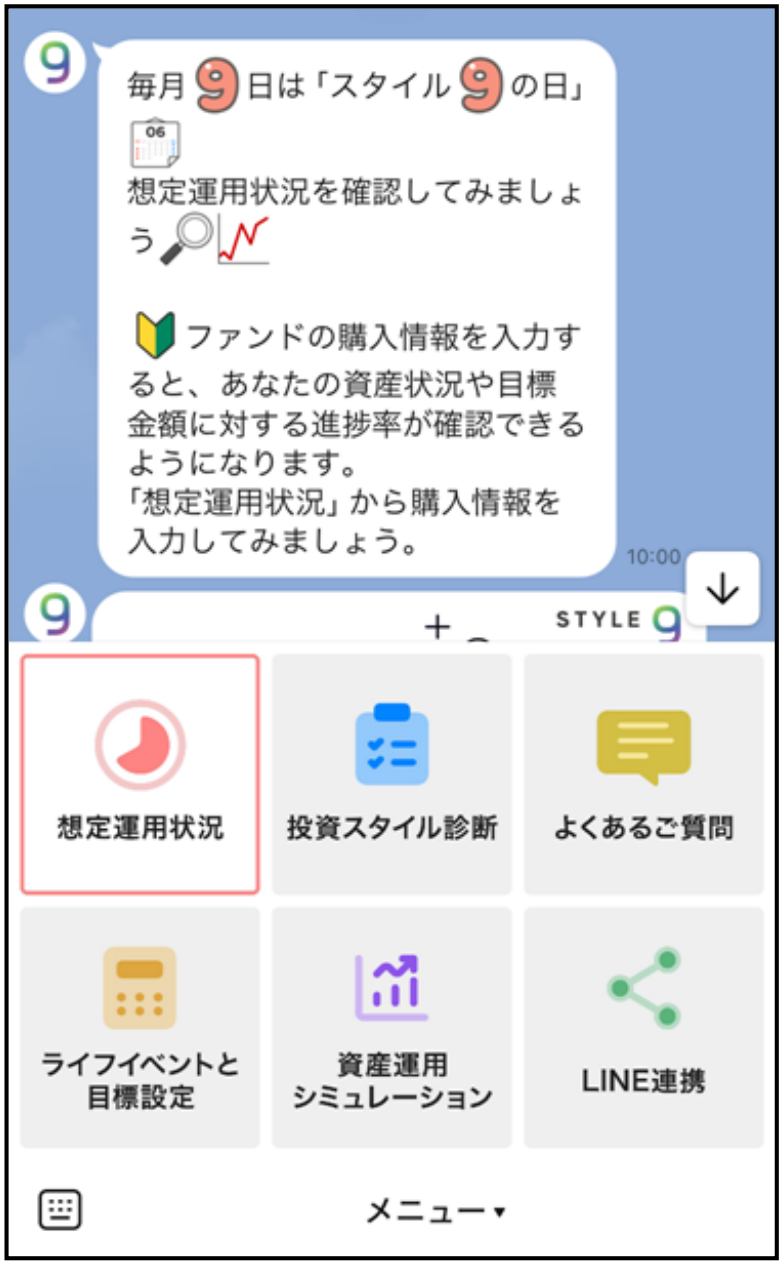 …約定情報を入力すると「スタイル9の公式LINE」があなたの想定運用状況をお知らせ!運用の進捗状況を手軽に確認できます。