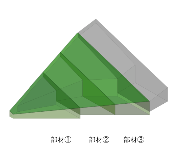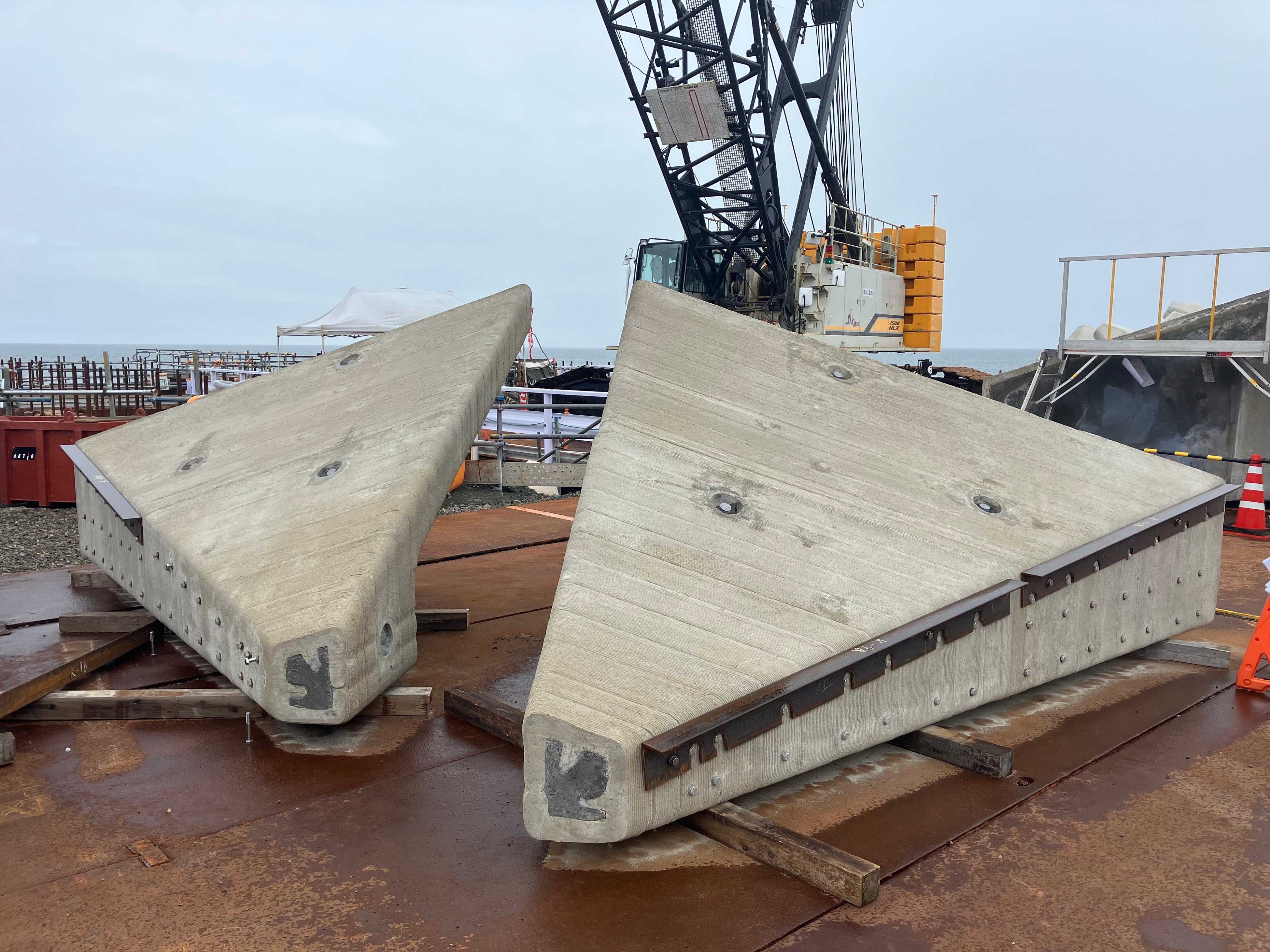 本工事において設置する潜水突堤は、幅約16m、長さ約42m、高さ約3~7mの大型構造物であり、その先端摺付部は3次元的に滑らかに変化する形状です。先端摺付部は、既存の工法では多数のPCaパネルを必要とし、最大35.5tの超重量物となるため、施工の安全性や品質管理の面で課題がありました。