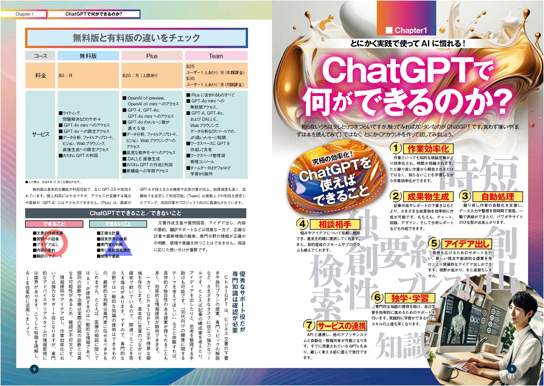 「ChatGPTで何ができるのか?」をやさしく指南。ビジネス文書の下書きから、創造的なアイデア出しなど、幅広いタスクを効率化する方法を具体的に紹介します。ChatGPTの得意分野と苦手分野を明確に示し、より効果的に使いこなすためのテクニックを網羅。さらに、無料版と有料版の違いを徹底比較し、自分に合ったプラン選びをサポートします。
