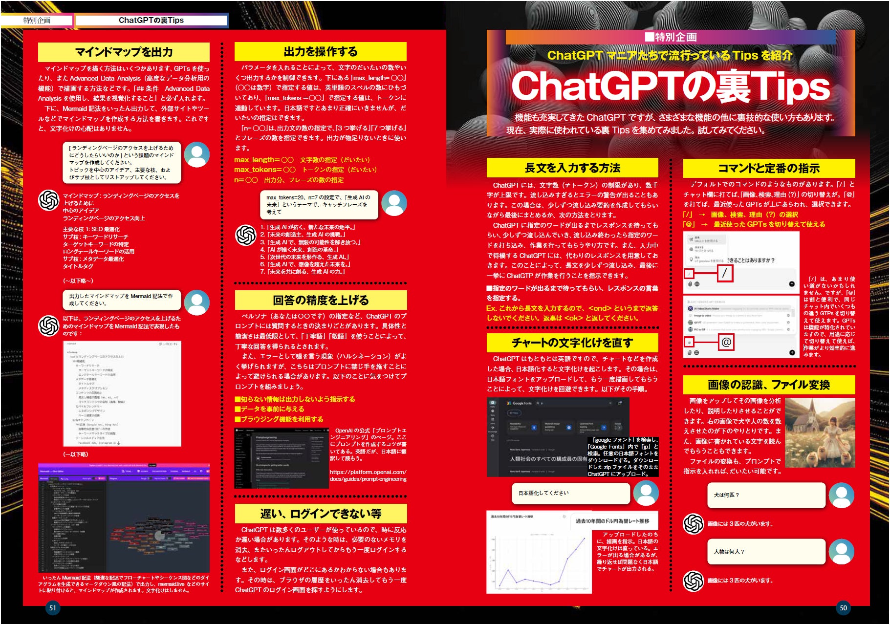 ChatGPTの裏技も紹介。ほかに定型プロンプト集、生成AI用語事典も掲載。より使いやすくためになる誌面を目指しました。