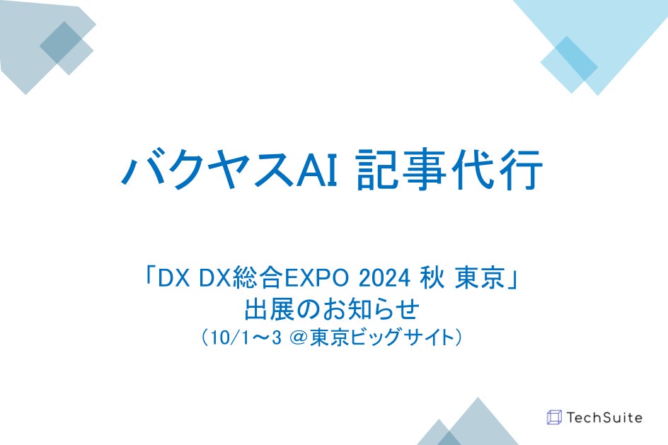 TechSuite株式会社は10/1より東京ビッグサイトで開催される「DX 総合EXPO2024 秋 東京」に出展し、生成AIを活用したSEO記事執筆サービス「バクヤスAI 記事代行」をご紹介します