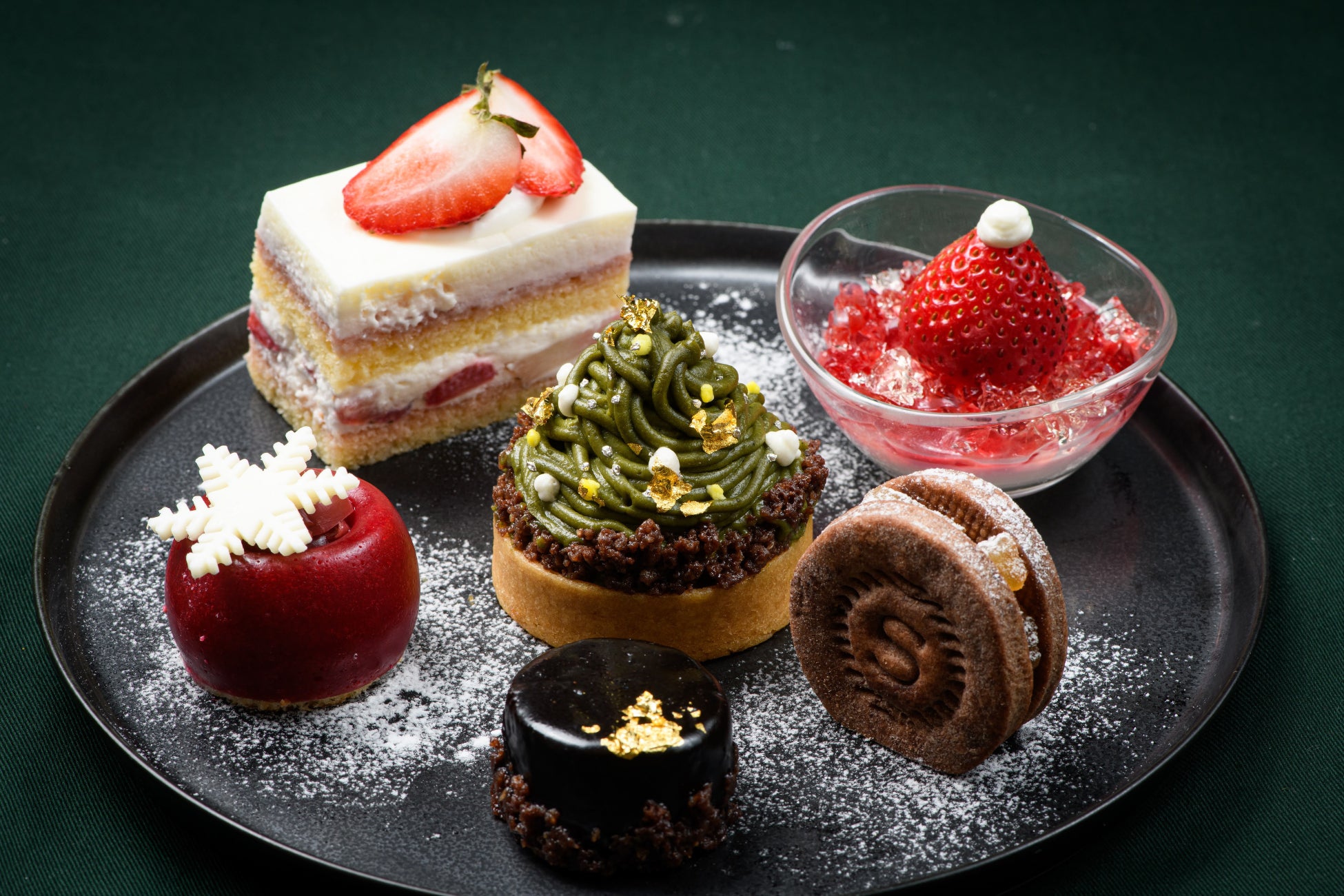 知覧紅茶とイチジクのグラサージュショコラ / ピスタチオとグリオットのツリータルト / 苺のショートケーキ / シナモンアップルサンド / ラズベリーとグリオットのムース / ベリーと白ワインジュレのパンナコッタ