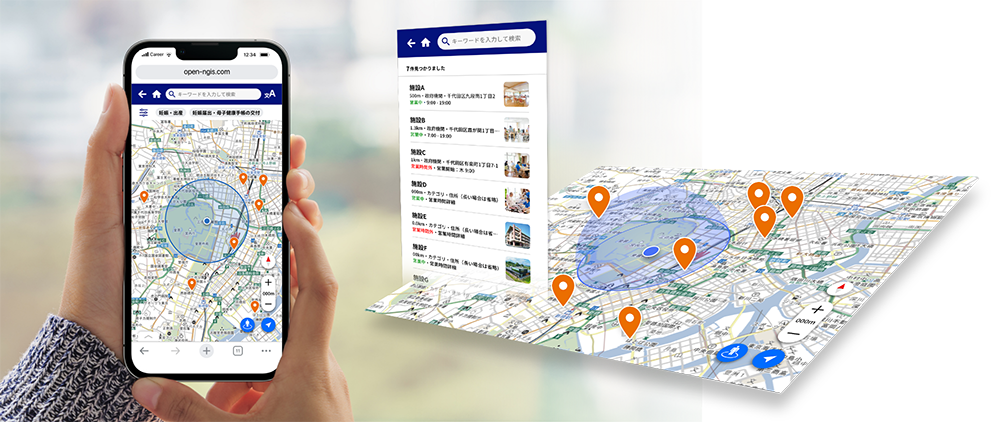 住民に使いやすいUIで、ライフイベントやアクティビティ、施設のジャンル、困りごとなどの検索機能を搭載しています。また、レスポンシブWebデザインを採用し、スマートフォンで表示した場合は現在地を中心に表示することが可能です。これにより、住民が必要な情報を探しやすくすることを支援します。
