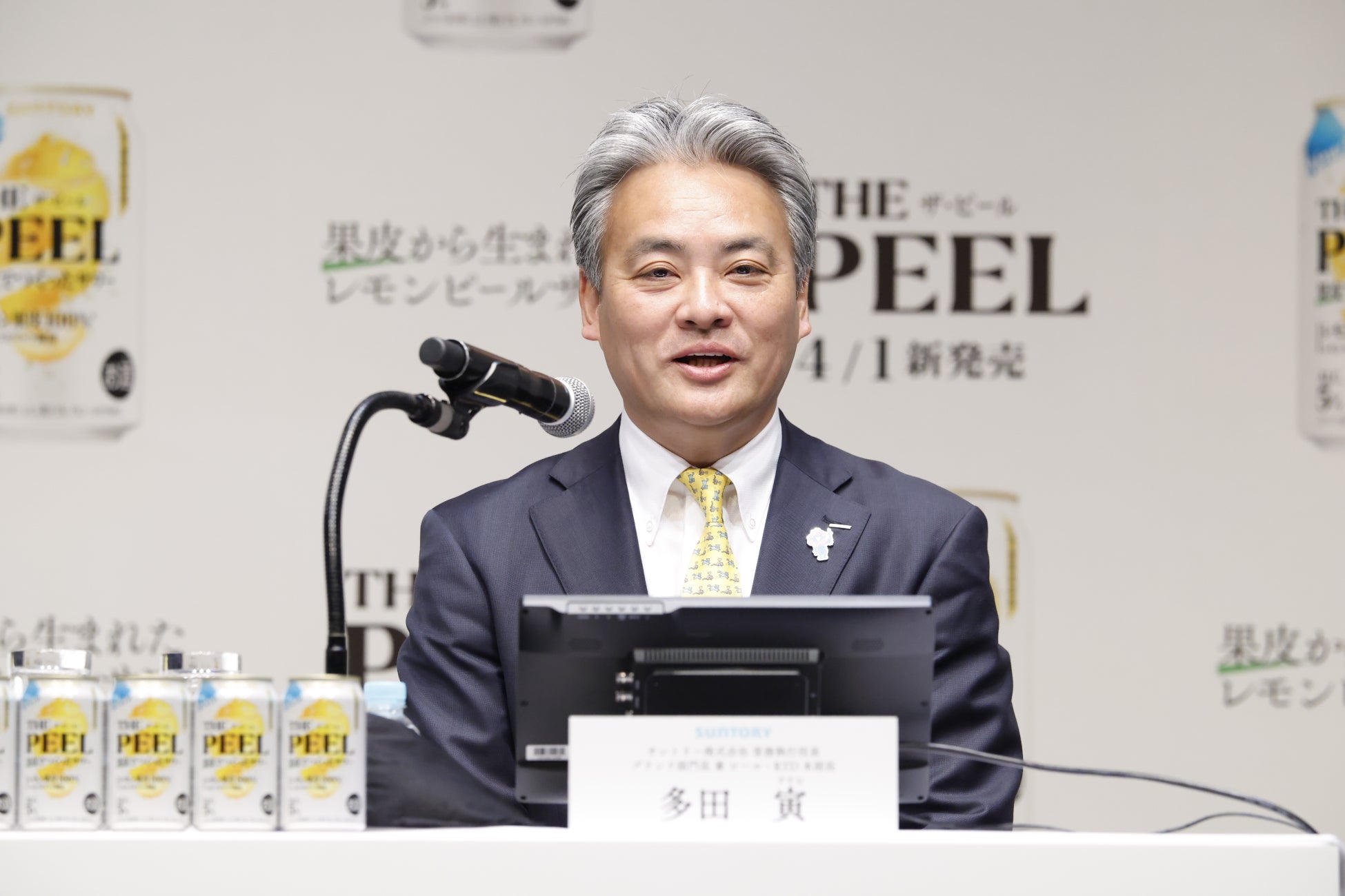 多田より、「THE PEEL〈レモン〉」の商品説明を実施。「THE PEEL〈レモン〉」の発売は、リーディングカンパニーとしてさらにRTD市場を牽引すべく、ビールユーザーのRTD併飲を促進し、需要創造へチャレンジするものであること、また総勢5,000人を超える調査の末、レモン果皮を切り口にした“果皮から生まれたレモンピールサワー”という新しいコンセプトにたどり着き、ビール好きの方に向けた新しい選択肢の提案として「THE PEEL〈レモン〉」 を発表しました。