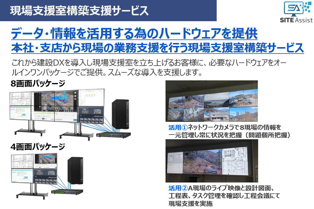 現在、建設現場業務の効率化・省人化の取り組みの中で、いわゆる現場支援室の設置など、本社など遠隔から現場を支援する体制作りを進める動きが広がりつつあります。当社では上述の「SAダッシュボード」、データ情報関連コンテンツとともに、現場支援室で活用される大型ディスプレイ等のハードや現場におけるインターネット通信環境等をパッケージで提供することで遠隔支援の環境構築を包括的に支援してまいります。