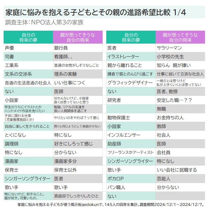 【受験シーズン】NPO法人第3の家族が家庭環境に悩む子どもとその親の進路希望比較表を公表。93.8%が進路希望に親子の差異あり。