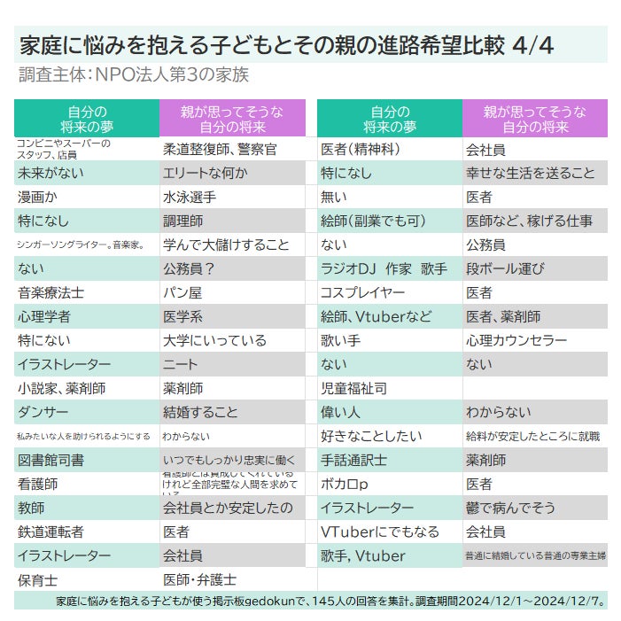 NPO法人第3の家族が開発・運営する、家庭環境に悩む子ども・若者のための掲示板gedokunでは、親子関係や家庭に関する悩みが日々寄せられます。特に、この受験シーズンは進路に関する悩みの投稿が増加します。