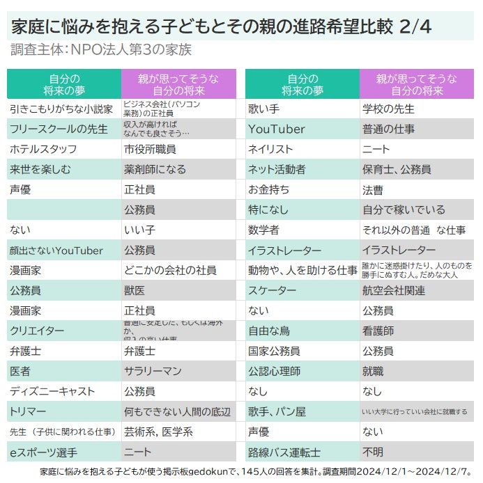 「自分はeスポーツ選手になりたいが、親には将来ニートだと思われている」といったような声もあり、子どもの将来に対して無職やニートといった進路の示唆が家庭内でされている可能性があります。特に、クリエイティブな進路を希望している子どもに多く見られました。