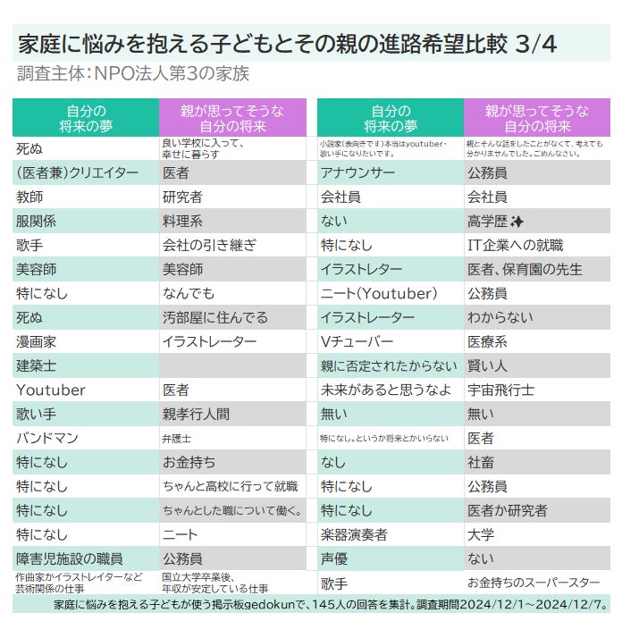 掲示板に寄せられた投稿では、「子どもが希望する進路」と「親が期待している進路」が異なる様子が確認されています。