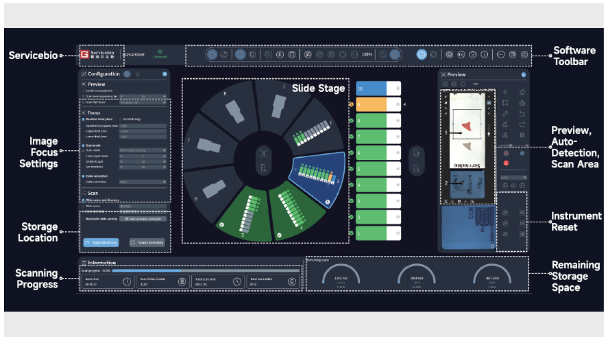 専用のスキャンソフトウェアと画像閲覧・解析環境を提供しており、高度なソフトウェア制御により、フォーカス調整、スキャン領域の認識、装置制御までを一元的に管理します。単層・多層・被写界深度拡張(EDF)など多様なスキャンモードに対応し、プレビュー機能や自動化機能を活用することで、高精度かつ効率的なスキャン運用を実現します。さらに、プレビュー、スキャン設定、画像確認までを直感的に操作できるため、デジタルパソロジー初心者でも導入しやすい設計となっています。