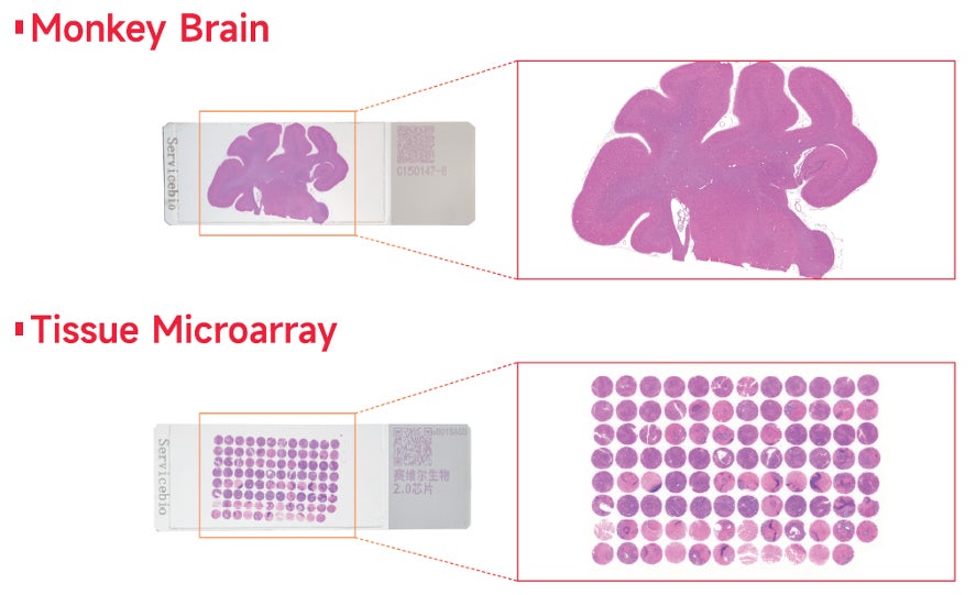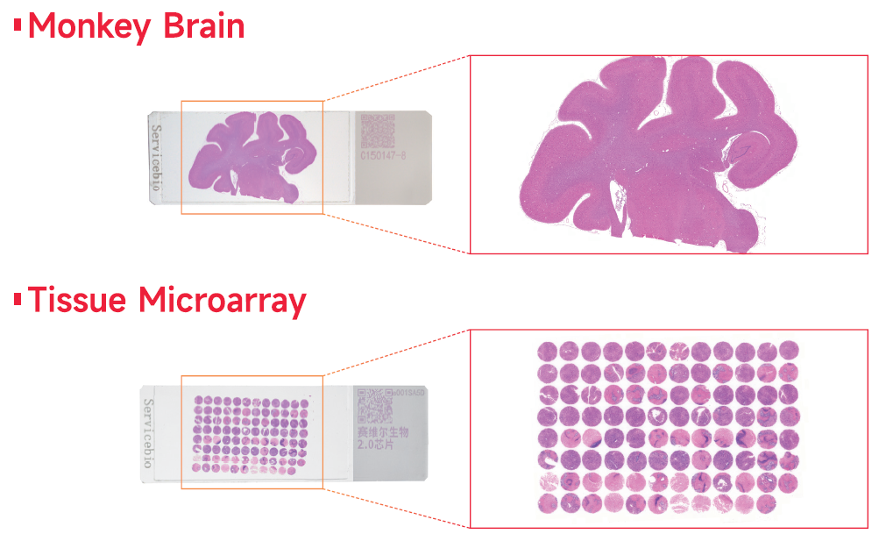 スライド上の非白色領域全体を対象として、組織マイクロアレイやサル脳などの大型組織を高速にスキャン可能です。