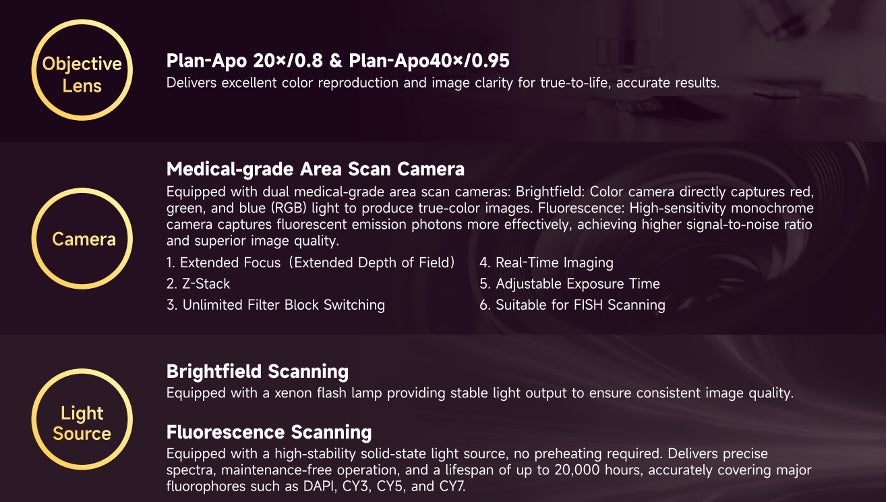 高品質対物レンズと高感度カメラを採用し、組織構造や染色コントラストを忠実に再現。