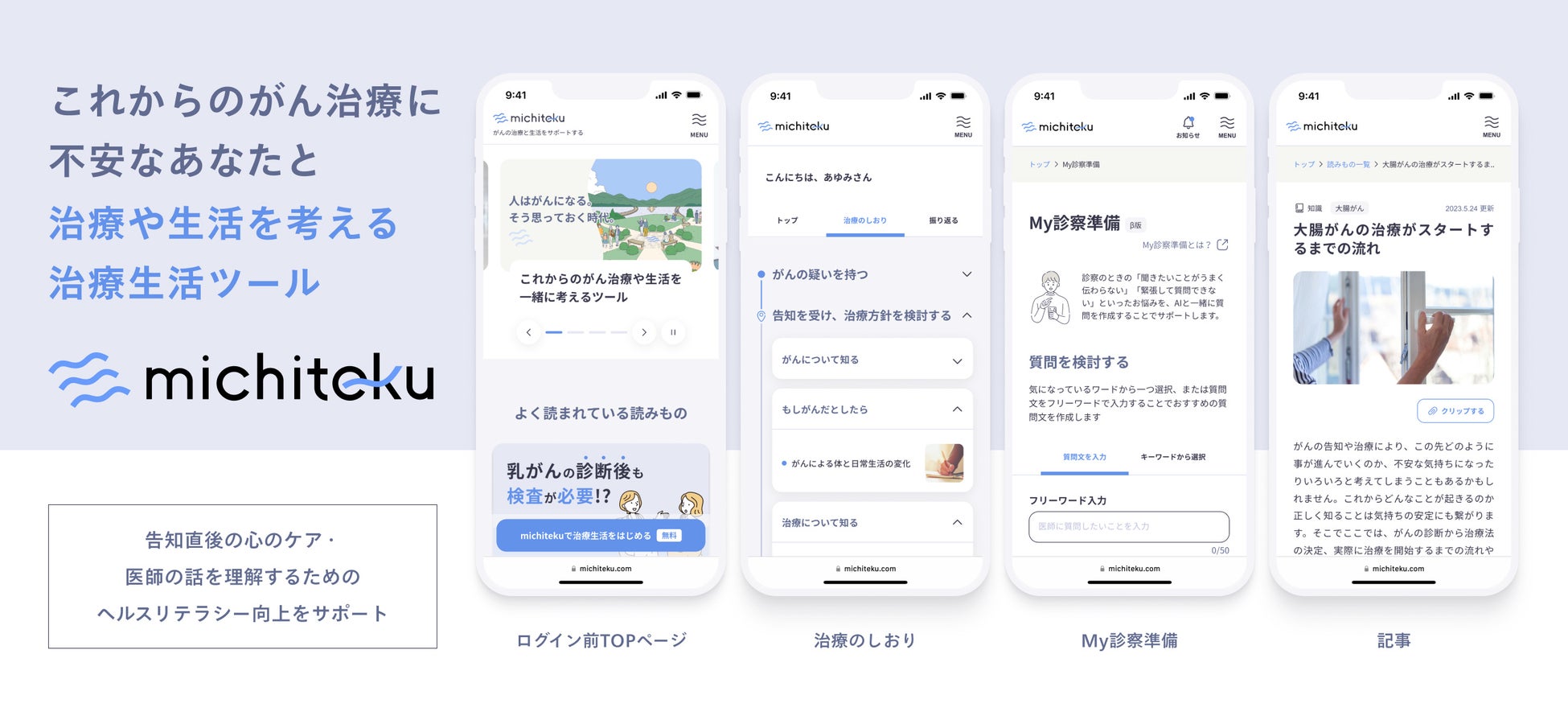 「michiteku」は、当社の公式サイト(https://michiteku.com)より会員登録を行うことで、すべての機能を無料でお使いいただけます。現在は、大腸がん・肺がん・胃がん・乳がん・子宮頸がん・子宮体がんに対応しています。