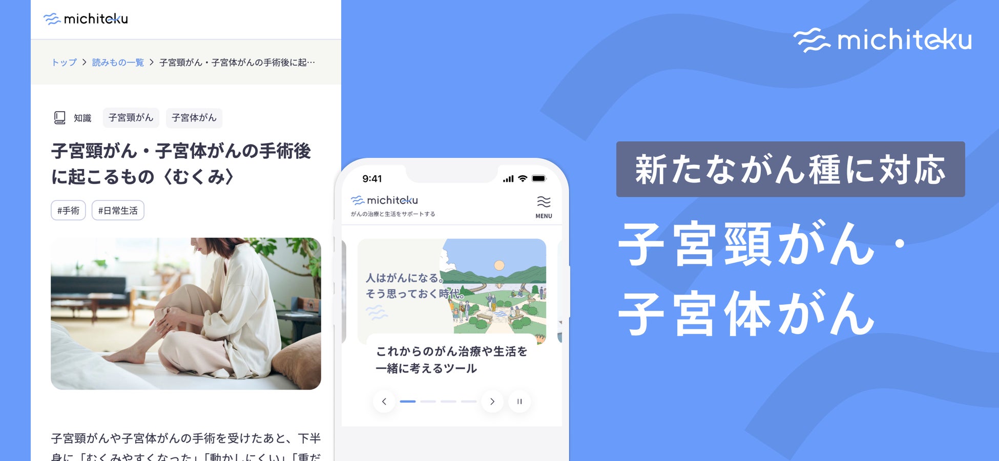 株式会社michiteku(本社:東京都中央区、代表取締役社長:藤山 昌彦、以下「当社」)は、がん患者さん向け治療生活サポートツール「michiteku」において、婦人科領域のがんである「子宮頸がん」および「子宮体がん」のコンテンツを新たに追加し、提供開始したことをお知らせいたします。