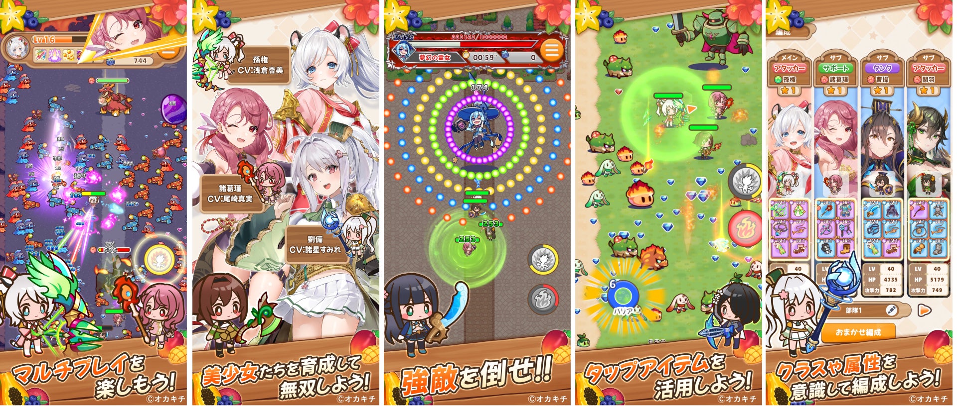 「三国志」を題材に美少女化した武将「ちゃんごく武将」と共に世界を冒険する「ちゃんごくし!」シリーズ第三弾。本作は、迫りくる大量のモンスター達を、ランダムに獲得できるアイテムやスキルを使って無双できる、爽快ローグライクマルチアクションです。簡単マッチングで最大4人の仲間とマルチプレイで遊ぶこともできます。