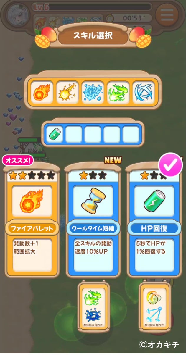 経験値を一定量貯めると、装備している武器のスキルに加えて、新しいスキルやアイテムをランダムで獲得できるように!同じスキルを選択し続けスキルの強化を行うか、スキルを組み合わせて新しいスキルに進化させるか、プレイヤーの選択次第で戦況も変わります。