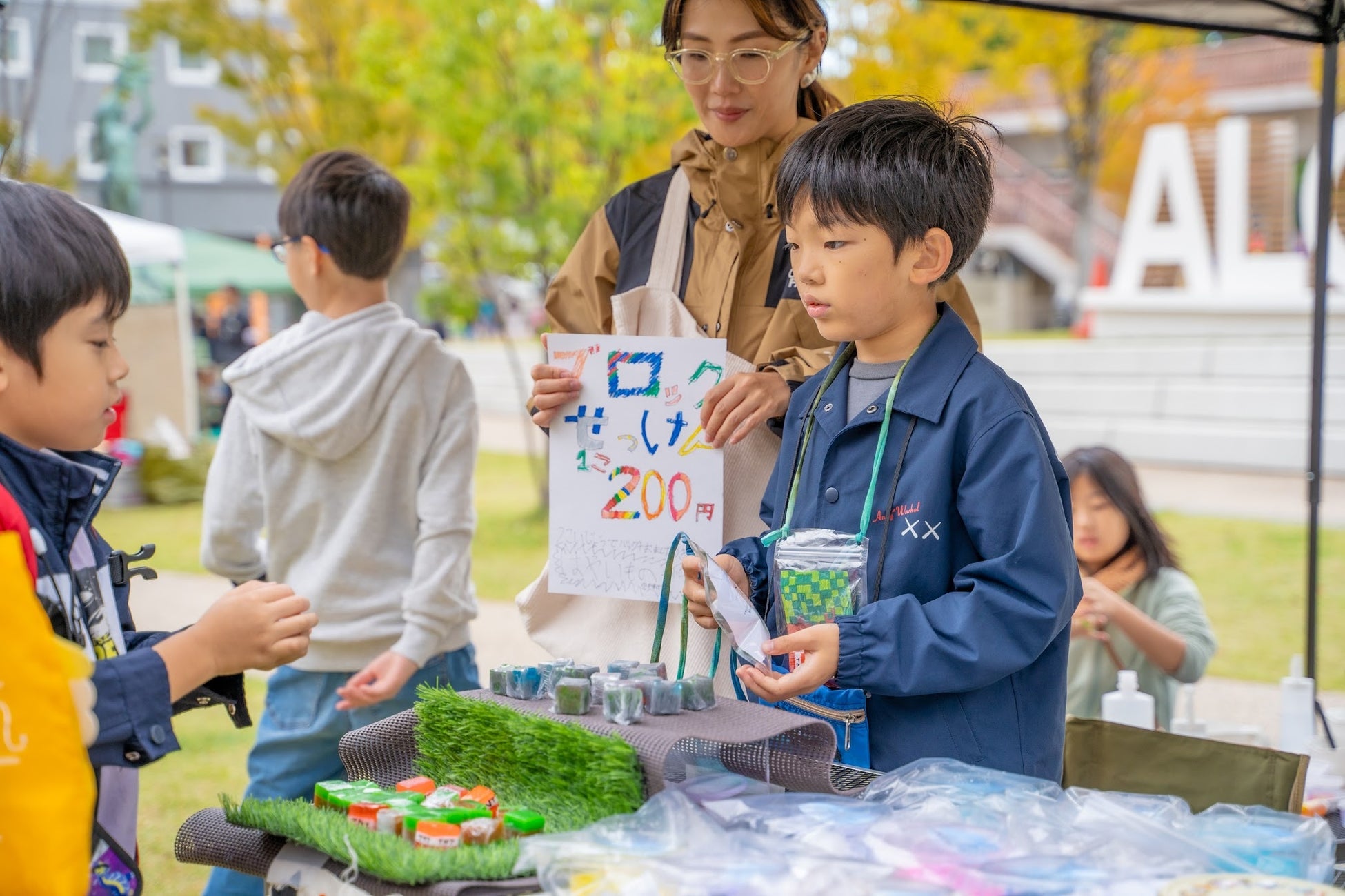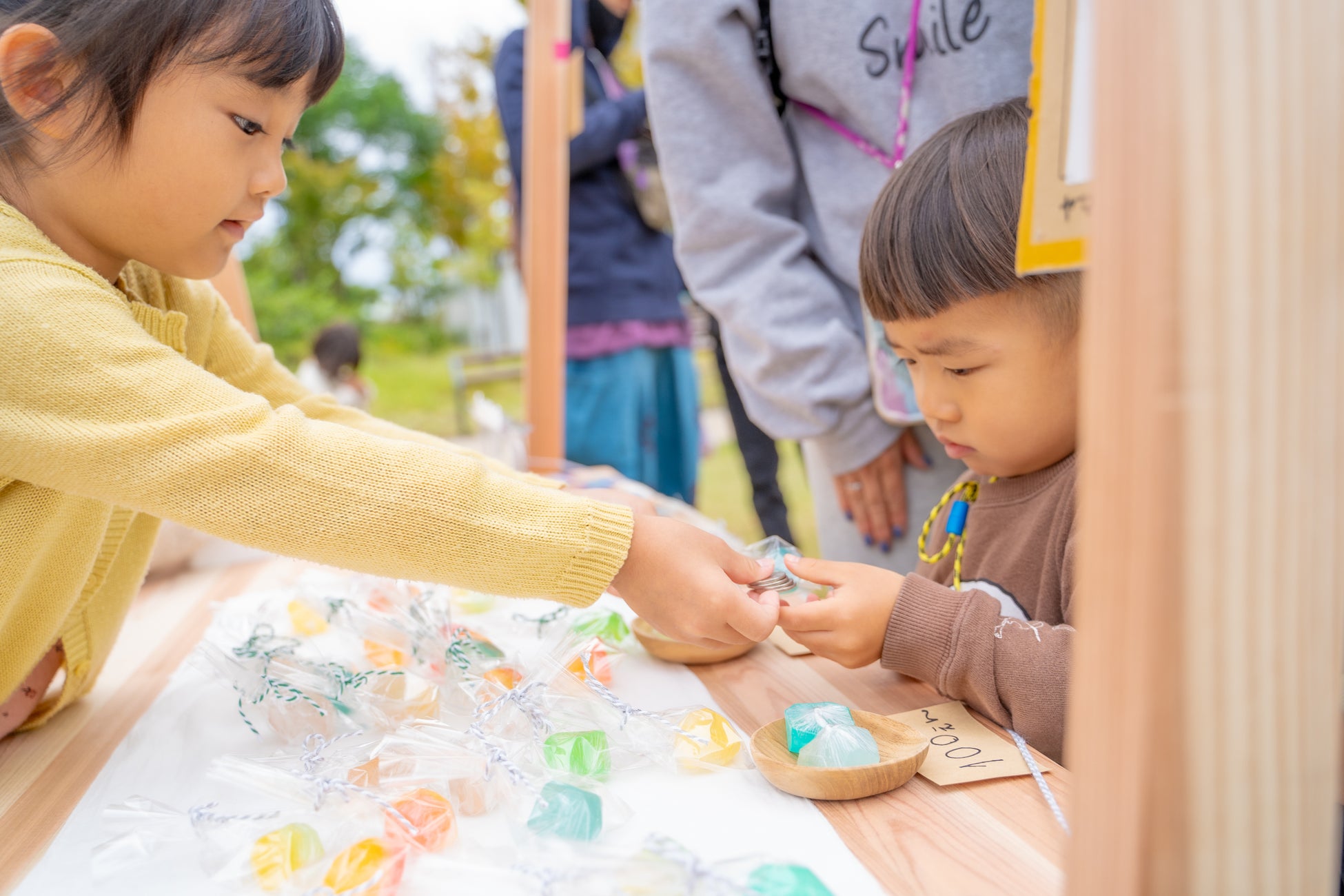 出店キッズたちの熱気に誘われるように、会場には早い時間から多くの人が来場しました。自分のお小遣いを握りしめてきたこどもたちの姿も多く、自ら商品を選び、出店キッズに支払ってお釣りと商品を受け取るという一連の「お買い物」を楽しむ様子が至る所で見られました。