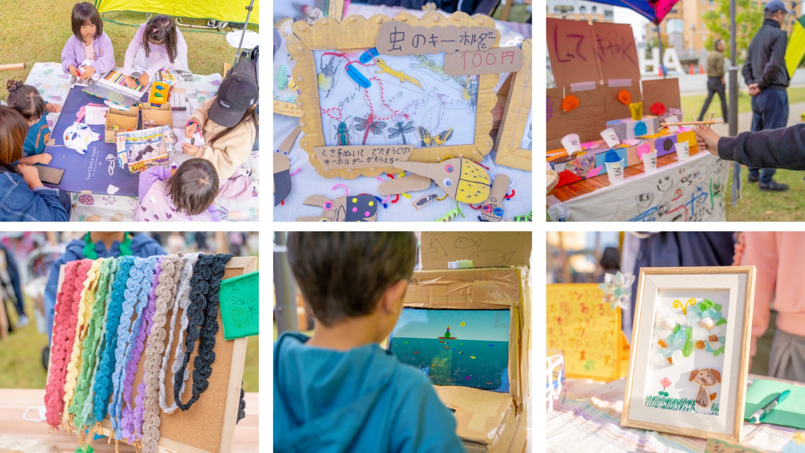 出店テントに丁寧に並べられた商品は、アクセサリー、イラスト、缶バッチ、キーホルダー、フォトスタンド等の手作り品販売テントの他、ミサンガづくりやお面のワークショップブース、自作ゲームセンターや虫になりきれるコーナーなど、それぞれにこどもたちの豊かな個性が存分に表現されていました。