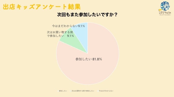 今後への出店意向に関しては、「また参加(出店)したい」という回答が81.8%と、大多数を占める結果になりました。来場していたこどもたちやニュースでマルシェのことを知ったこどもたちからも「次はいつやるの?」「私も出店したい!」という声が多数届いています。