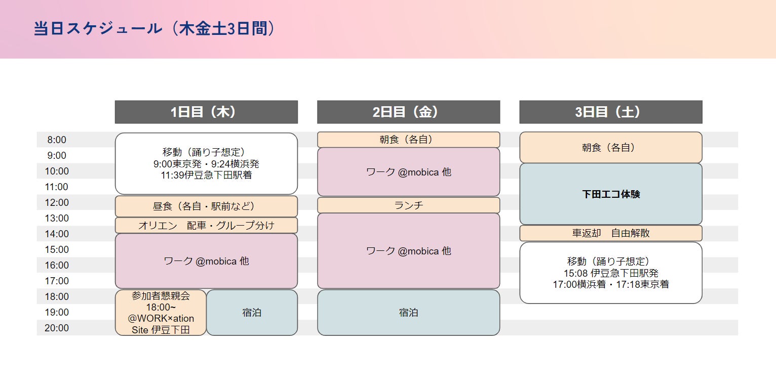 ・エコツーリズムを体験できる下田市にて、mobicaを利用して各地を移動しながら、豊かな自然の近くでワークを体感できるプログラムとなっています。 ・mobicaは参加者同士でシェアするかたち(乗り合い)でご利用いただきます。 (参考)mobica sand(ハイエース):推奨2-3名、mobica forest(N-VAN):推奨1-2名 ・グループでのご参加も歓迎です。 ・宿泊施設は各自でご手配ください。 ・ワークやランチの時間は「伊豆navi」を使って地元の情報を入手していただけます。まちなかのワークスペースを利用しながらまち全体を体験できるプログラムとなっています。 ※詳細は申込ページをご参照ください |
