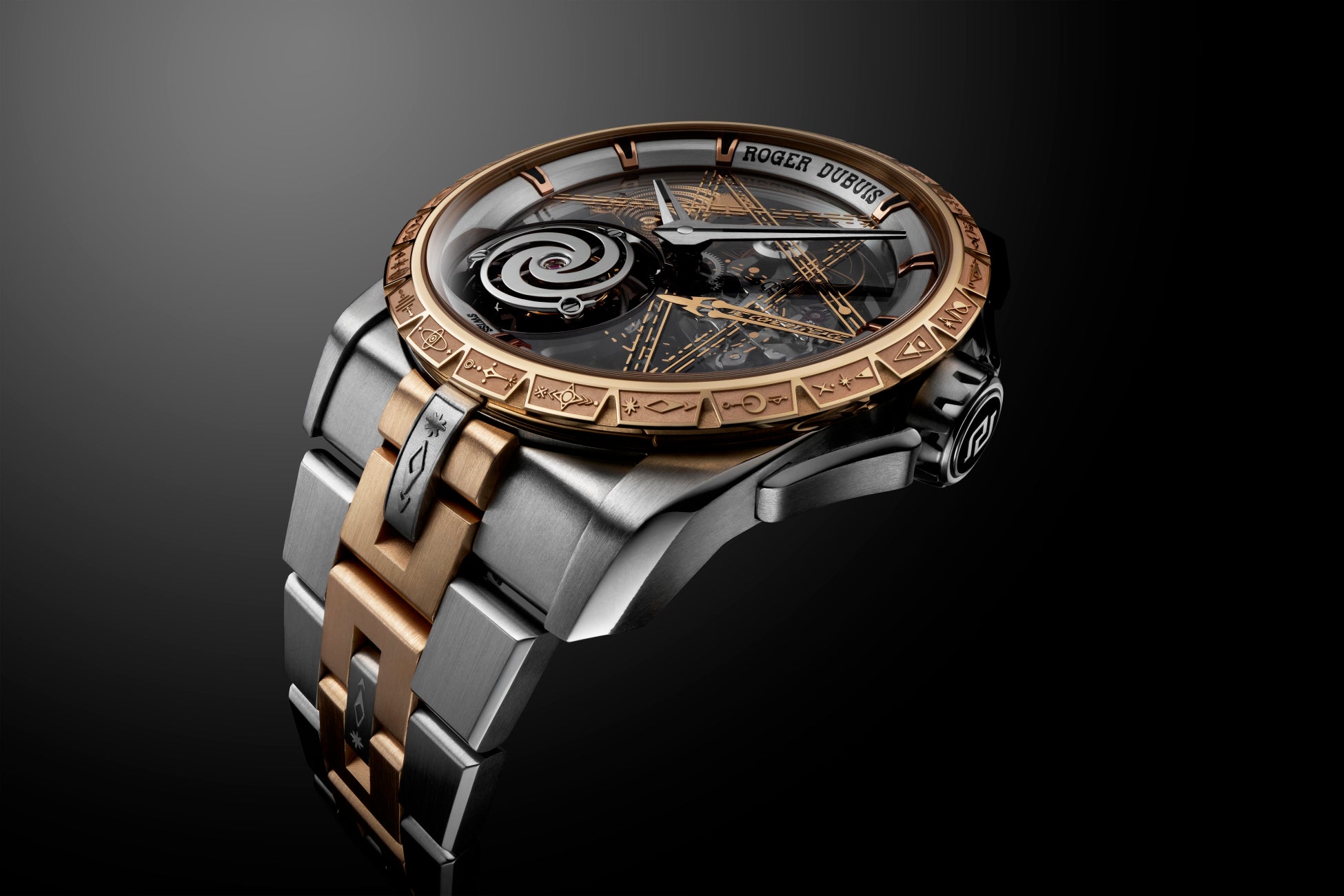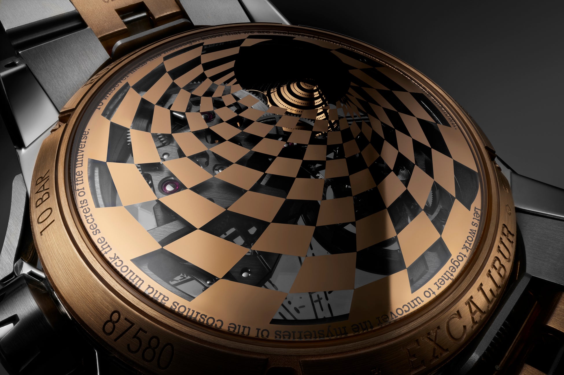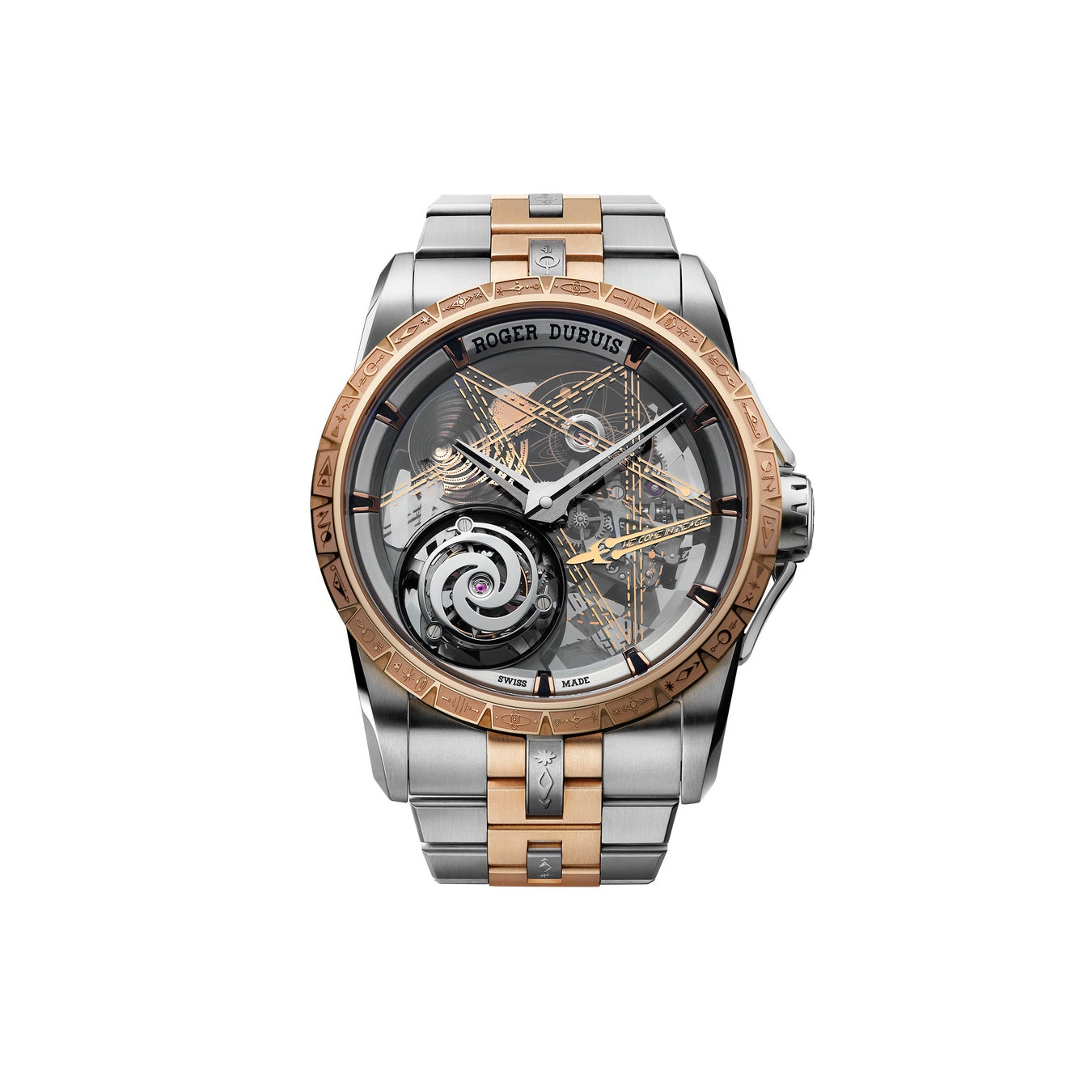 このエクスカリバータイムピースにインスピレーション溢れるすべてのディテールを収めるため、ロジェ・デュブイは18Kピンクゴールドとチタンという珍しい組み合わせを採用。これらの素材を42mmのケースとクイックリリースシステムを備えたブレスレットに取り入れることで、優美さ、耐久性、軽さを実現しました。