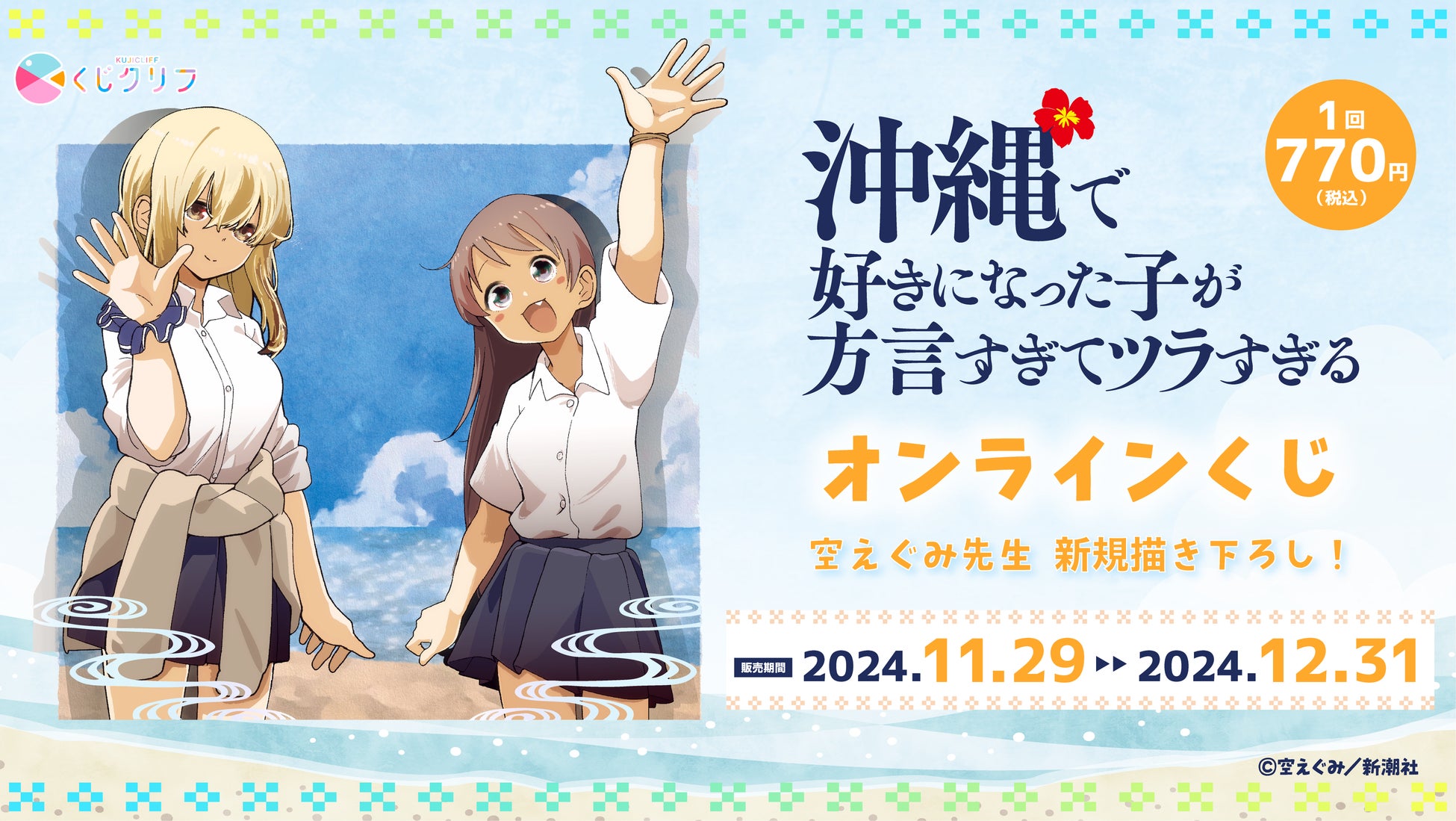 株式会社サトクリフ(本社:東京都千代田区 代表取締役社長:加藤 勝)は、運営するオンラインくじサービス「くじクリフ」より『沖縄で好きになった子が方言すぎてツラすぎる』オンラインくじを、2024年11月29日(金)10時より販売します。