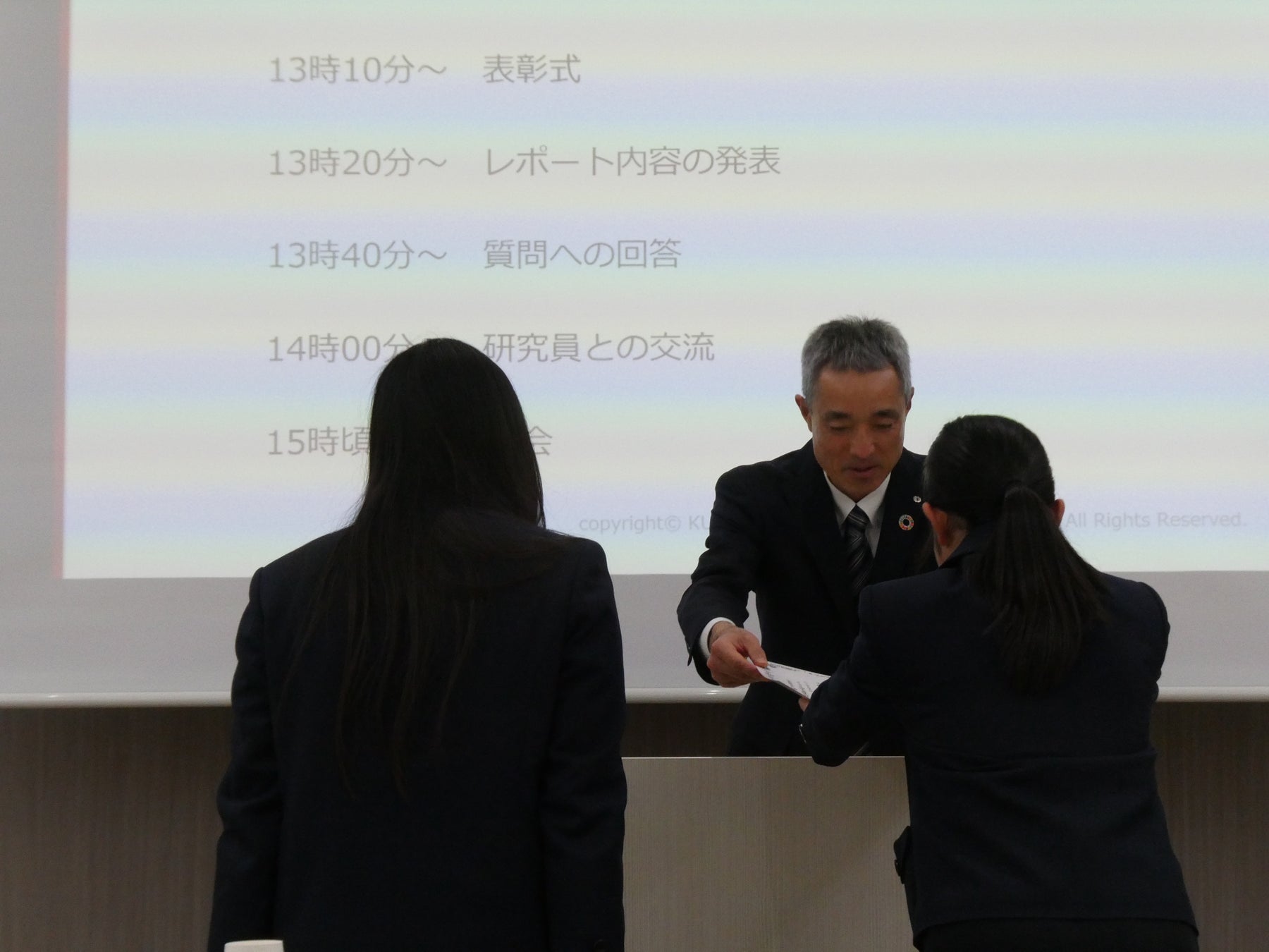 クミアイ化学は、世界の⾷料・農業を⽀える企業として未来を担う高校生の皆さんと⼀緒になって、⾷や農業に関する問題を考えるため、2025年5月から10月にかけて「第2回 高校生のための食育プログラム 食料生産に関するグループディスカッション」を実施いたしました。全249グループ967名が本企画に参加し、提出されたレポートを当社で審査した結果、京都教育大学付属高等学校のグループのレポートが優秀賞として選出されました。2026年2月16日には、優秀レポートを作成した高校生を当社の化学研究所(Shimizu Innovation Park/ShIP)にお招きして表彰式を開催し、会社紹介、所内の見学、高校生によるレポートに関するプレゼンテーション、質疑応答や当社役員・研究員との交流を行いました。質疑では多くの質問が寄せられ、研究や農薬についての理解をより深めていただく機会となりました。