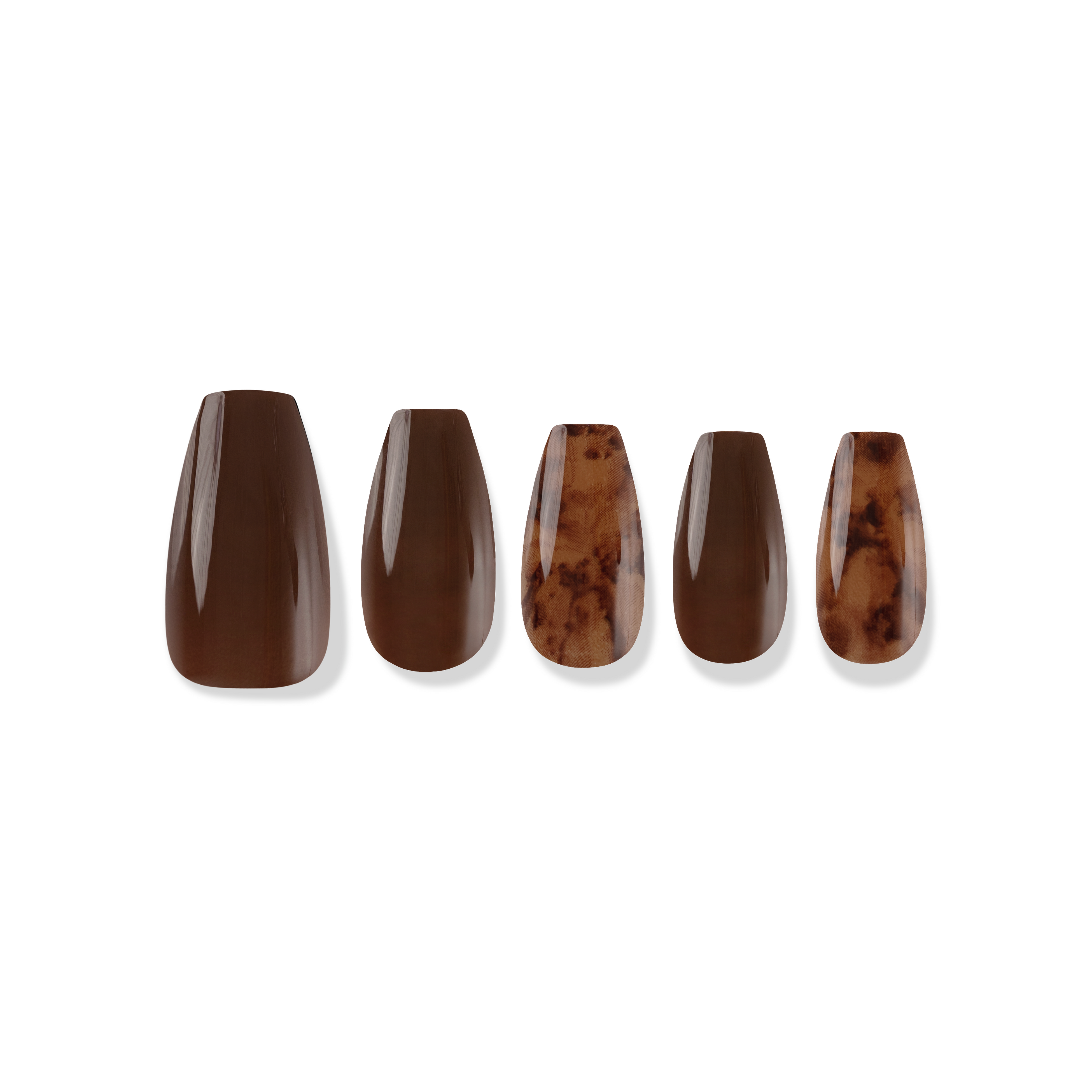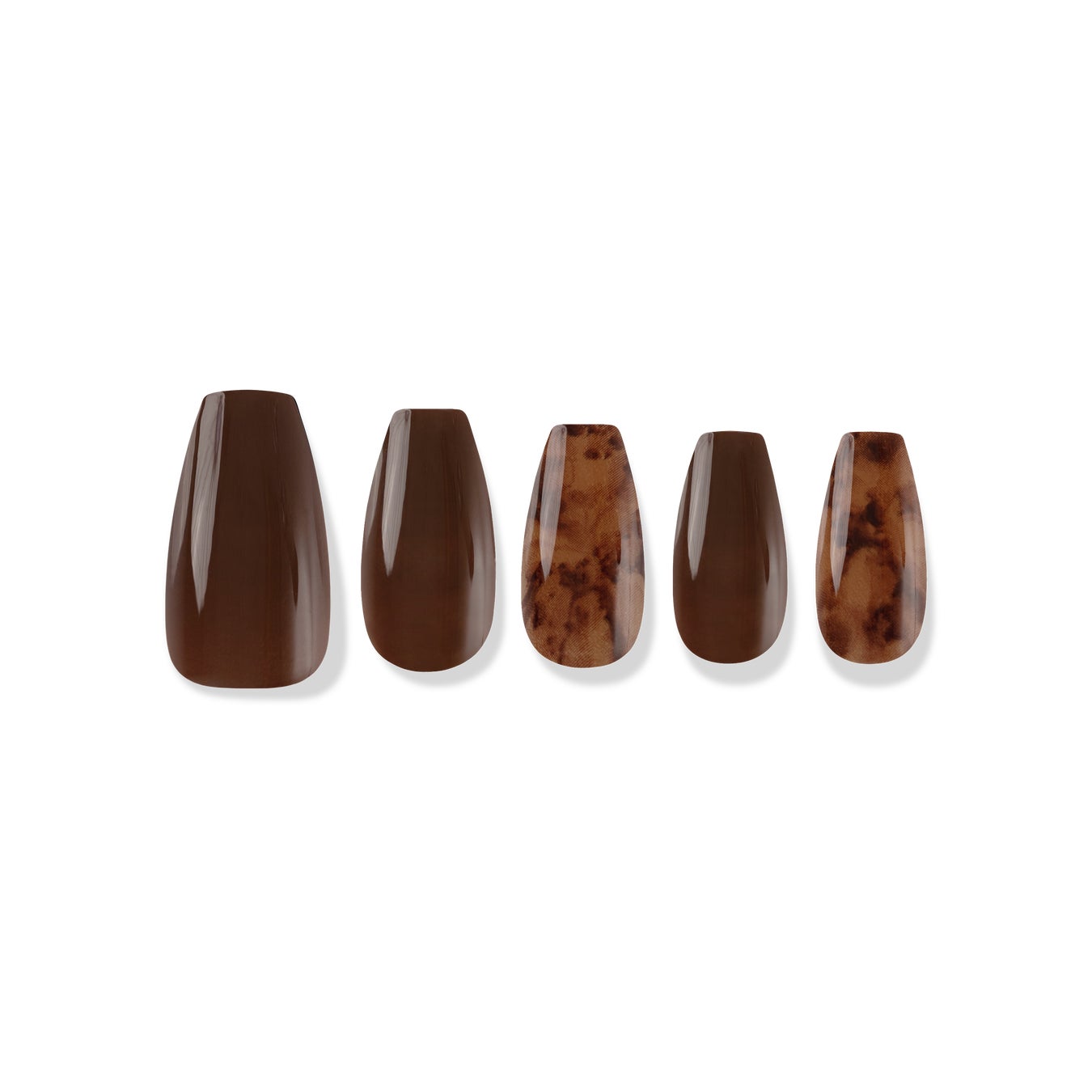 まるでエスプレッソのような絶妙な色合いのダークブラウンと、琥珀やべっ甲を思わせるマーブル柄がとても魅力的なネイル。