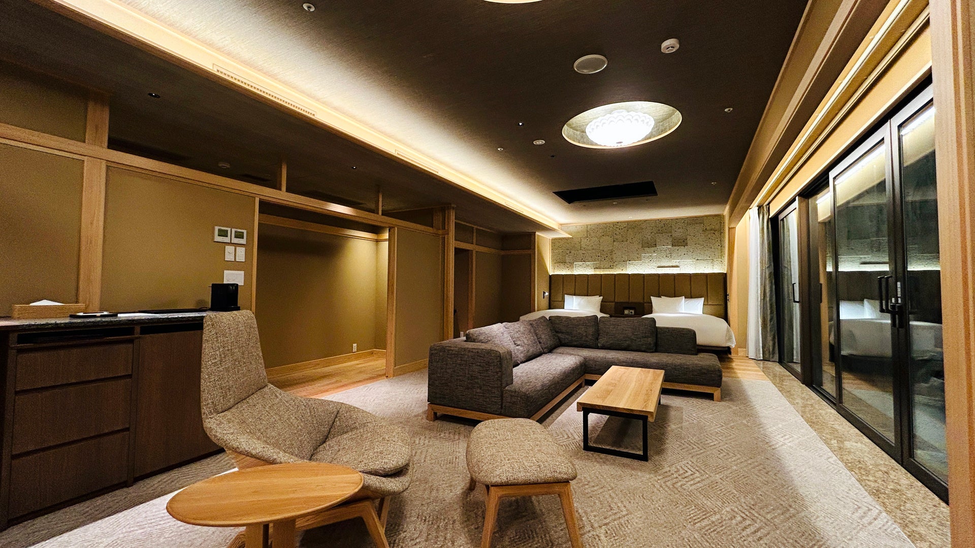 自分だけの専有温泉露天風呂が付いた4室のラグジュアリースイートは約100~200平米の広さを誇り、200平米超もの最大タイプの客室には、洲本温泉をなみなみと湛えた温泉露天風呂のほか、温泉水を使ったプライベートプールやサウナまで完備しています。