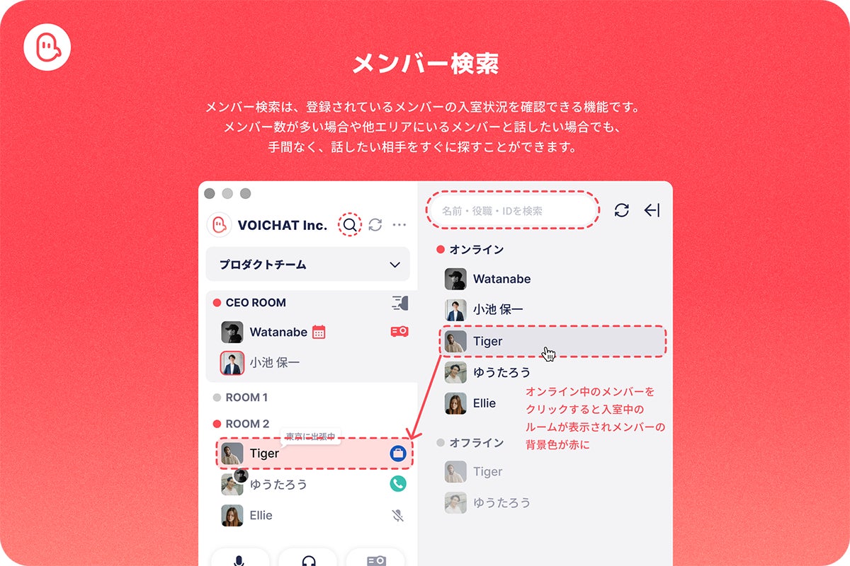 オンライン中のメンバー名をクリックすると、メンバーが入室中のルームが表示され、メンバー名の背景が赤く強調表示されます。