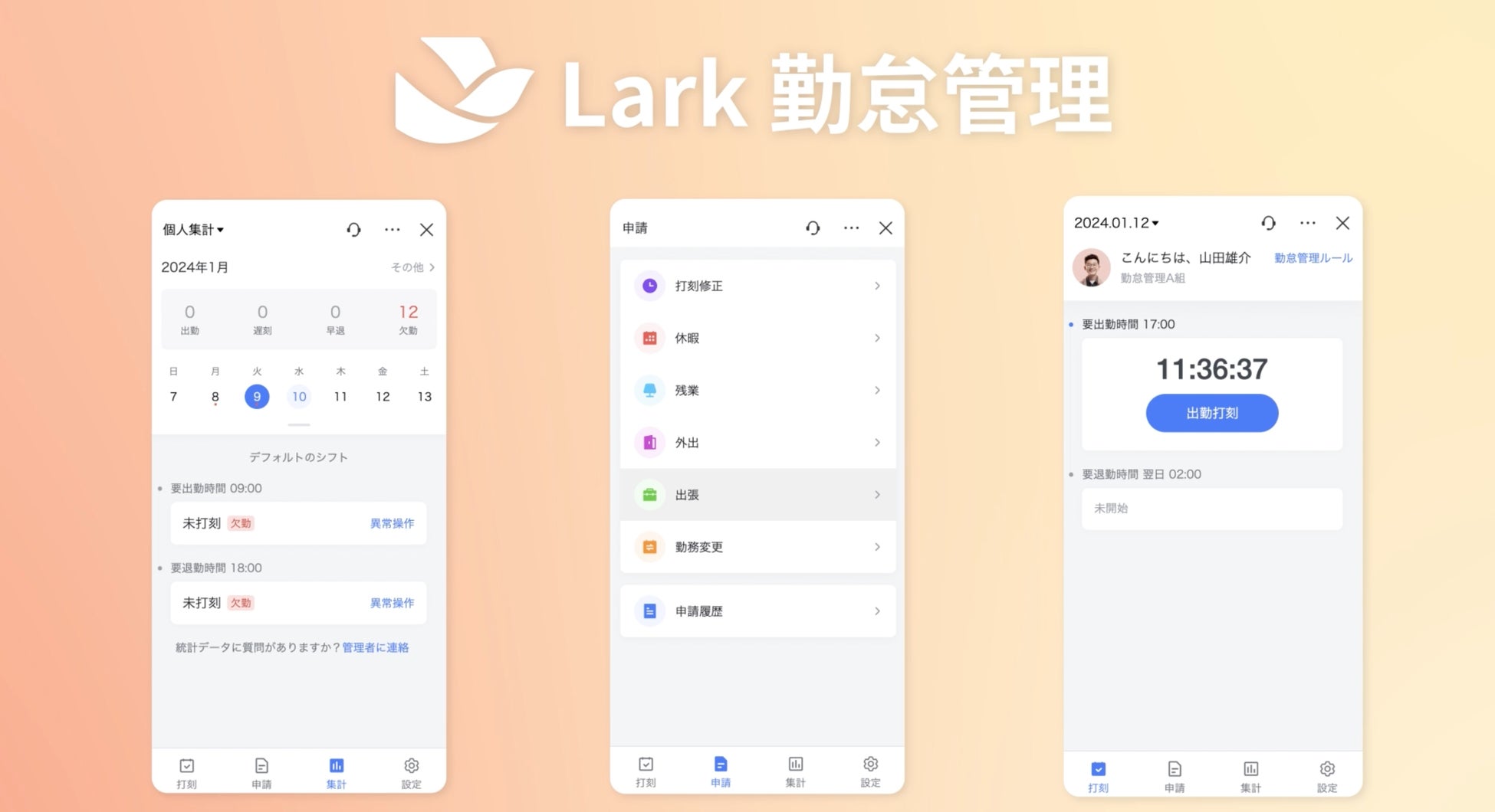 これまでの勤怠管理はタイムカードを使っていたにも関わらず、その情報をスプレッドシートに手入力で入れ直していました。Larkで勤怠管理を始めたことで、入力が自動化されるだけでなく、出退勤時間が明確になり労務管理の実態をより把握しやすくなりました。