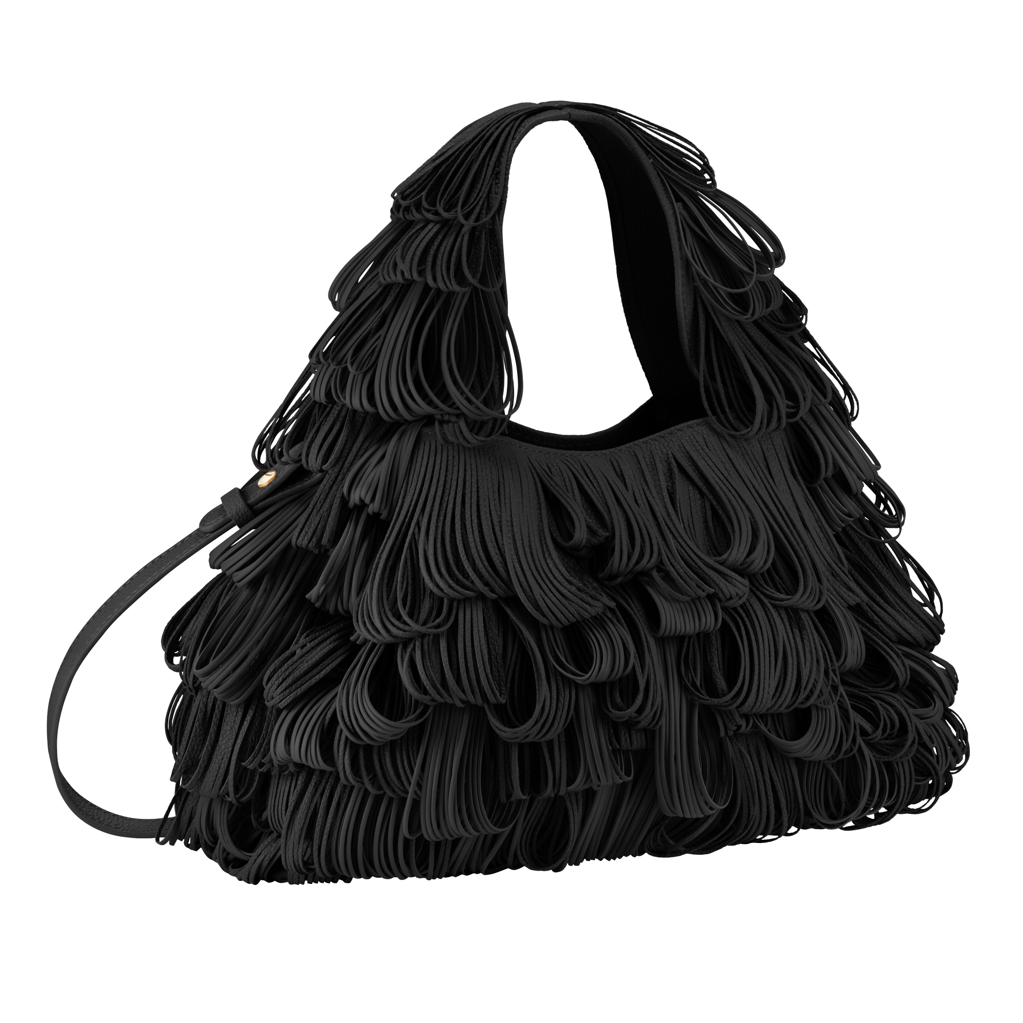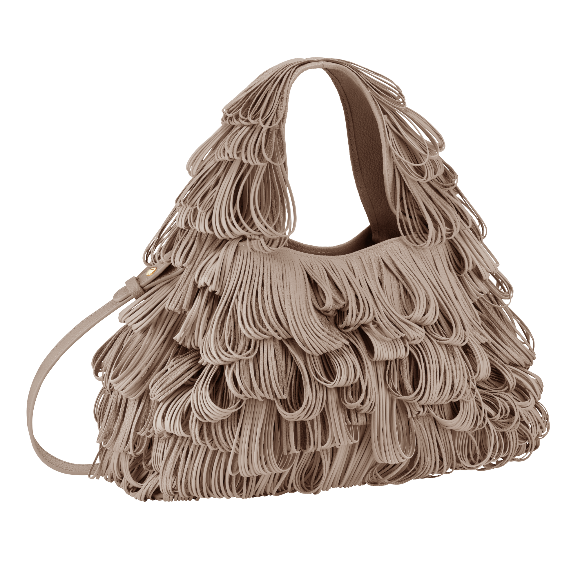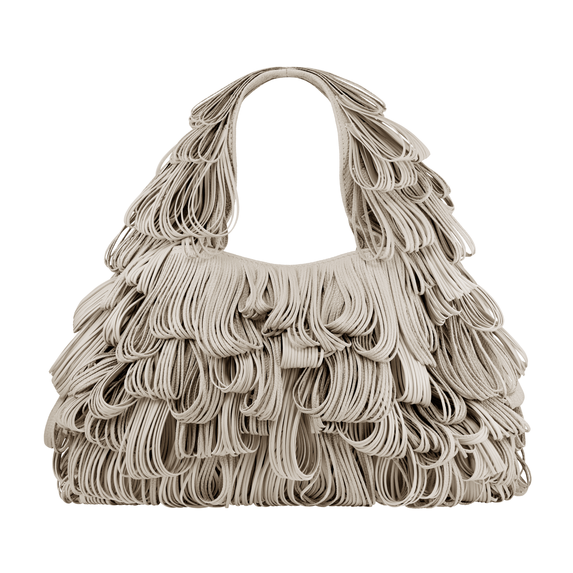 この特別なバッグは、レザーの端切れを活用したループ状のフリンジが施されており、その大胆かつエアリーなデザインが特徴。フリンジの装飾がバッグの華やかさを際立たせ、熟練の職人技によって、一つのバッグに176本のフリンジループが二人の職人の手で丁寧に縫い付けられています。このフリンジループは3つの異なる長さに折りたたまれ、立体的なグラデーションを生み出しています。
