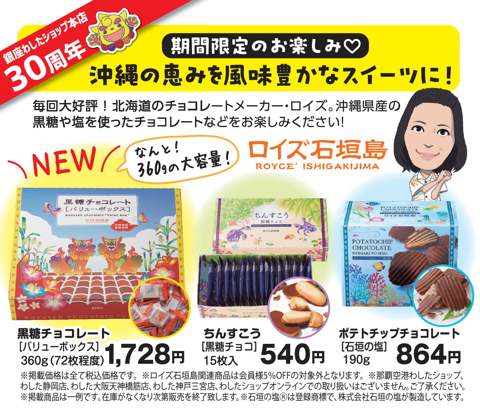 また、通常沖縄県内でしか購入できないロイズ石垣島商品を期間限定・店舗限定で販売いたします。(那覇空港わしたショップ・わした静岡店・わした大阪天神橋筋店・わした神戸三宮店・わしたショップオンラインでの取り扱いはなし)