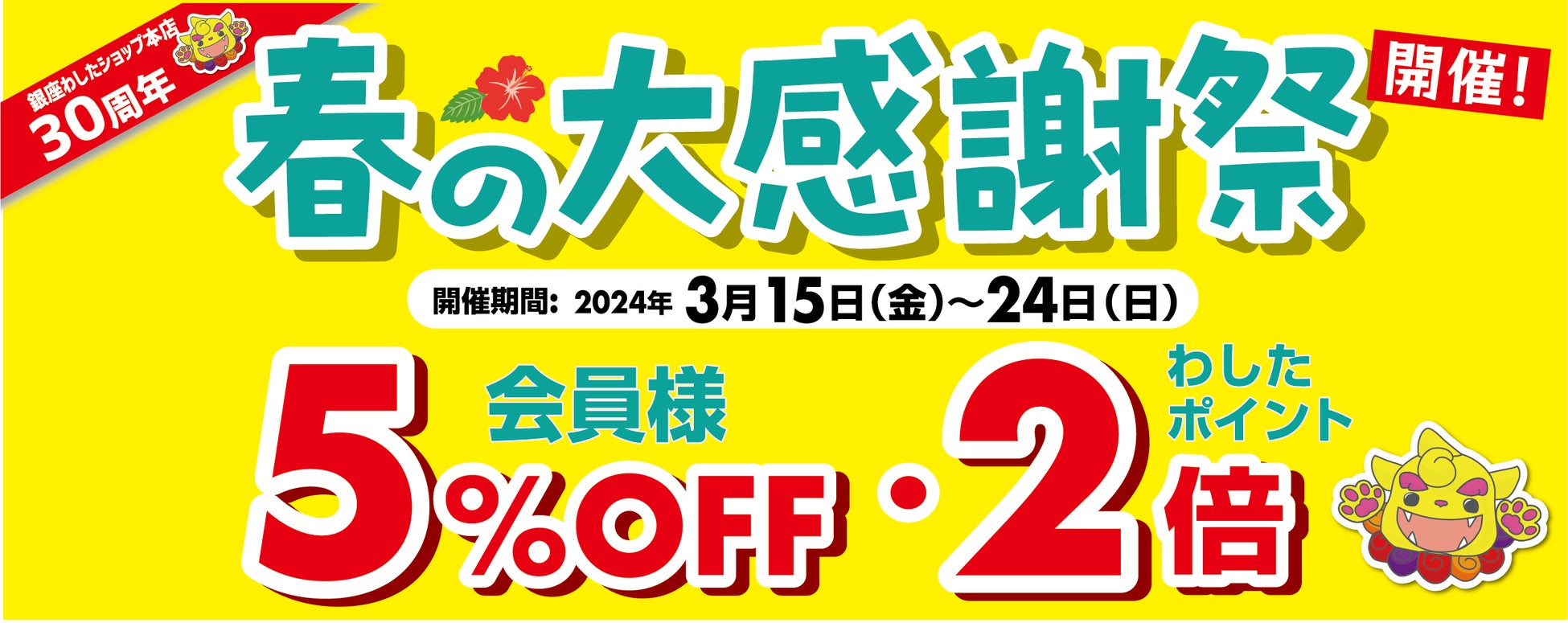 全国のわしたショップ10店舗およびわしたショップオンラインでは、日頃わしたショップをご愛顧いただいている会員様に感謝の気持ちを込めて、3月15日(金)~3月24日(日)の10日間、会員様は期間中のお買物が5%OFF、さらに、わしたショップポイントも2倍になる春の大感謝祭を開催いたします。(期間中新たに会員様になられた方も割引対象・ポイント2倍対象)