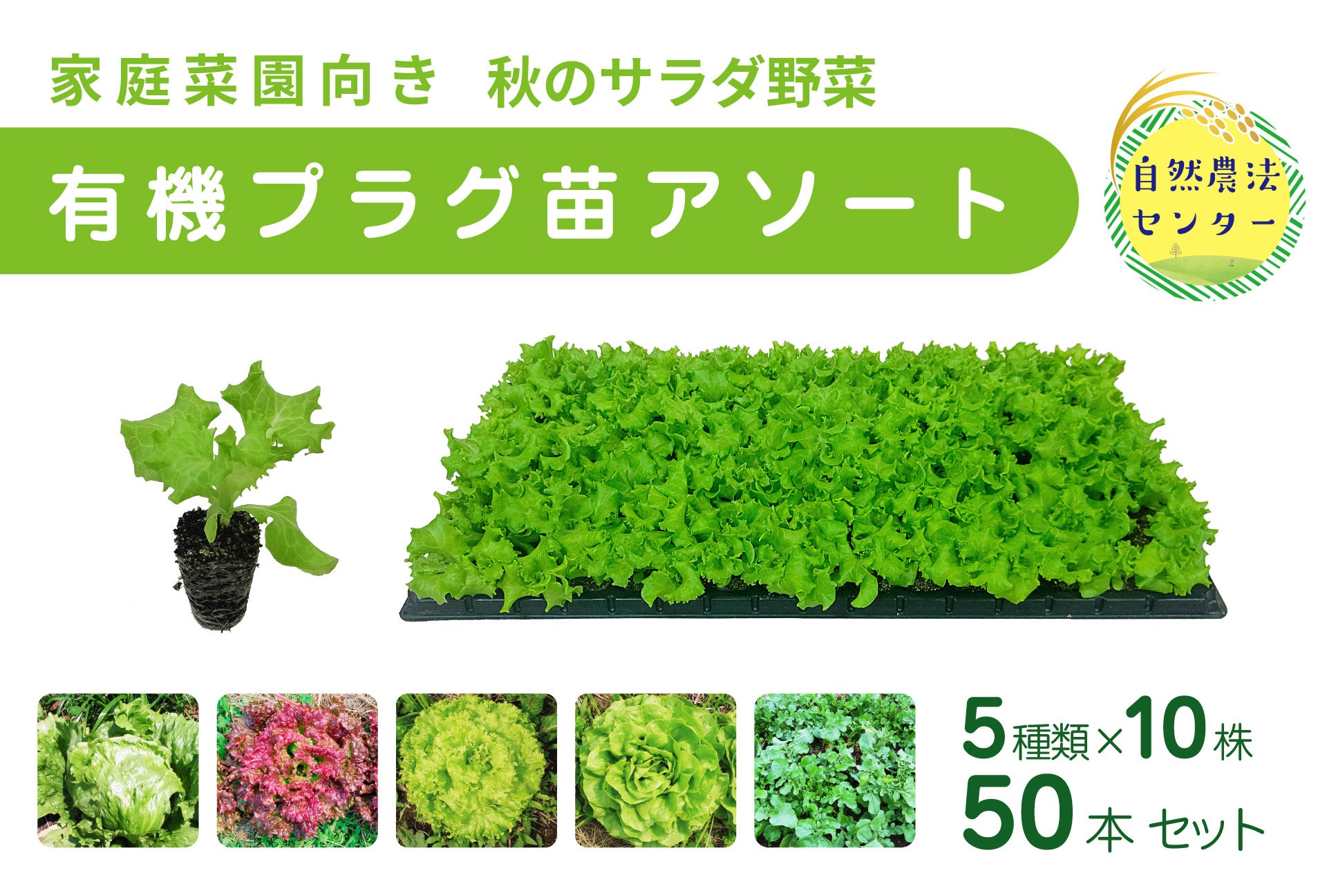 【受注販売】家庭菜園向き「有機プラグ苗アソート」新発売!! 秋のサラダ野菜5品種×10苗セット(公益財団法人 自然農法センター)