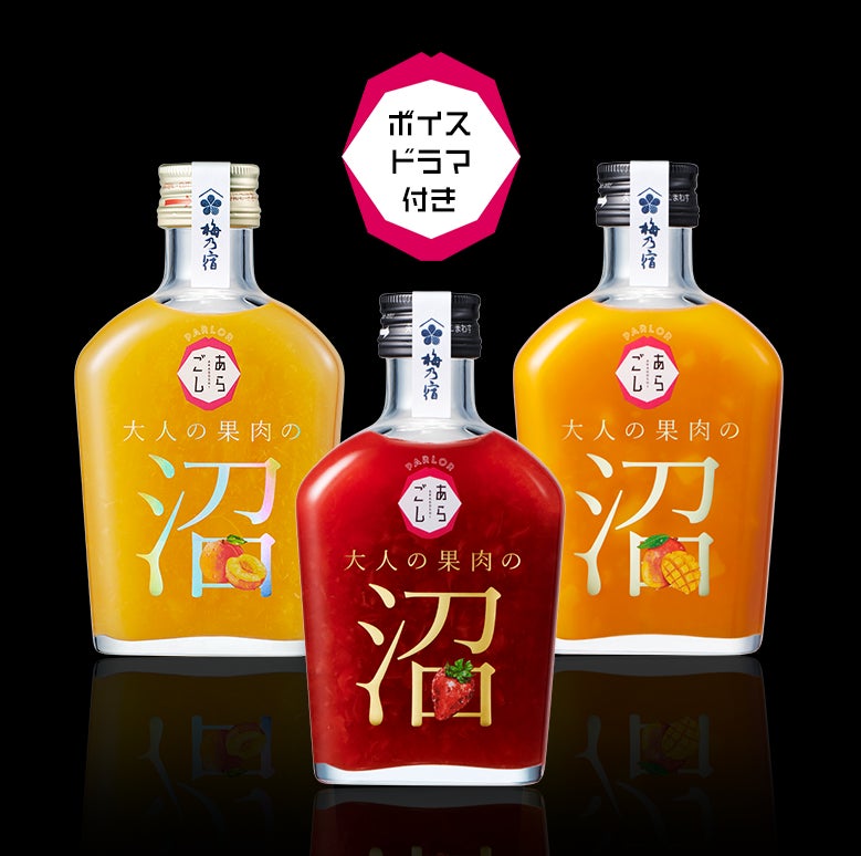 ボイスドラマには人気声優の山口勝平氏と青木瑠璃子氏が出演。梅乃宿酒造公式Xのユーザー投票で募ったシチュエーション設定をもとに、3つの物語を制作しました。サスペンス編、青春編、恋愛編と異なるドラマチックな展開の物語を聴きながら「大人の果肉の沼」を飲んでいただくことで、さまざまな気分での味わいを楽しんでいただけます。